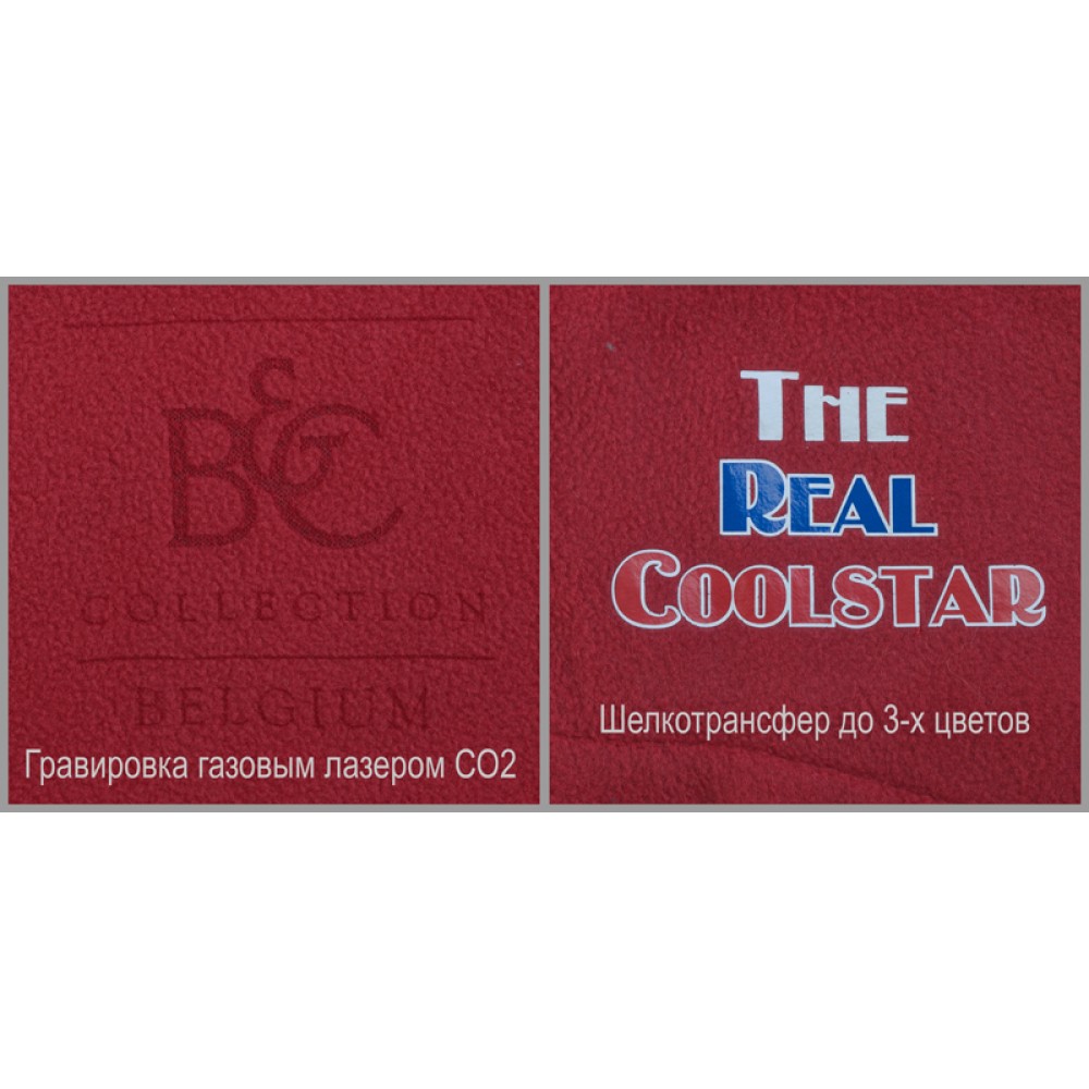 Возможно нанесение методом лазерной гравировки (газовый лазер СО2, код нанесения L1): детальная проработка мелких элементов и тонких линий с высоким контрастом изображения (рекомендуется на флисах темно-красного и стального серого цветов).