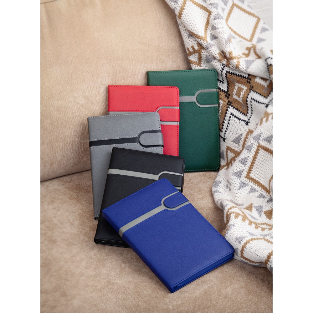 Матовая плотная обложка с выраженной текстурой натуральной кожи дополнена стильным вырезом – полосой серого цвета с прошивкой по периметру. Внутренний блок включает 256 страниц из бумаги плотностью 70 гр., срезом в цвет обложки и закладкой-ляссе, благодаря которой его удобно сразу открывать на нужной странице.