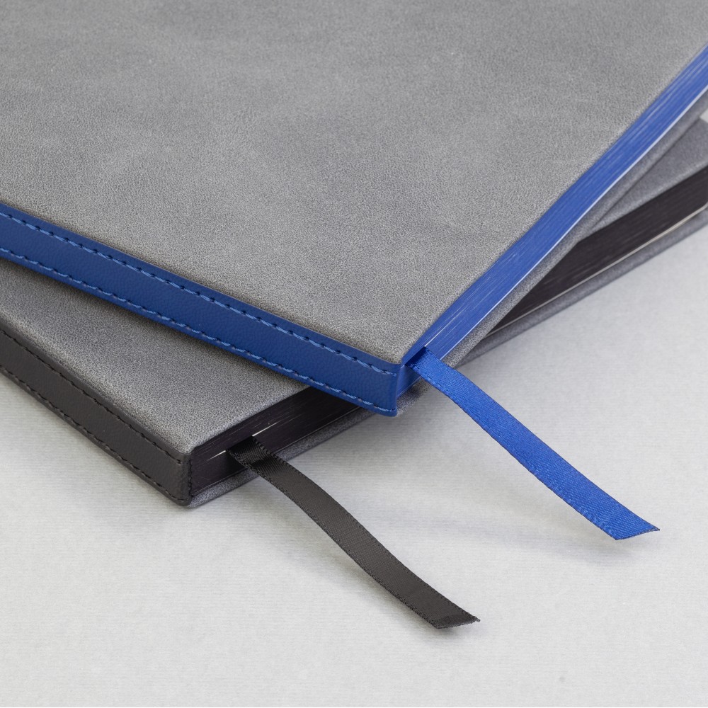 Ежедневник "Турин" в универсальном сером цвете с контрастной вставкой в корешке, придающей корпоративную идентичность. Стильный образ завершает цветной срез и ляссе в цвет вставки.