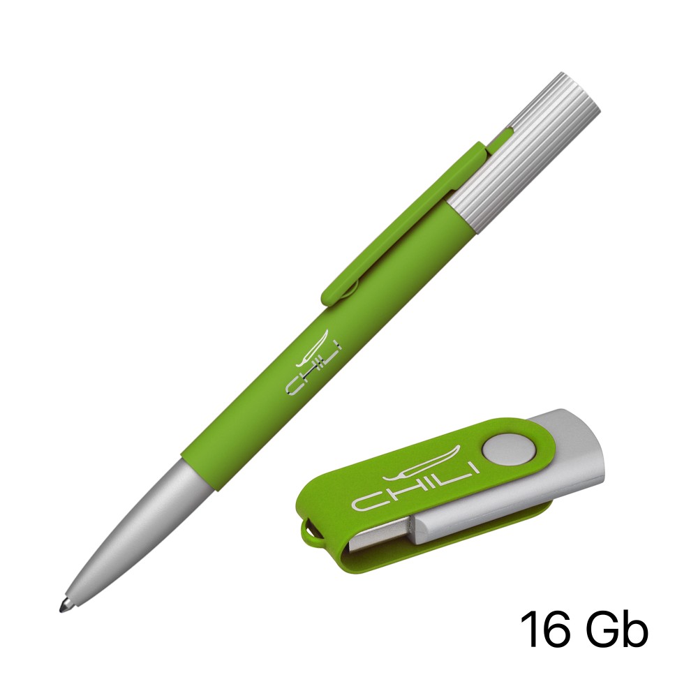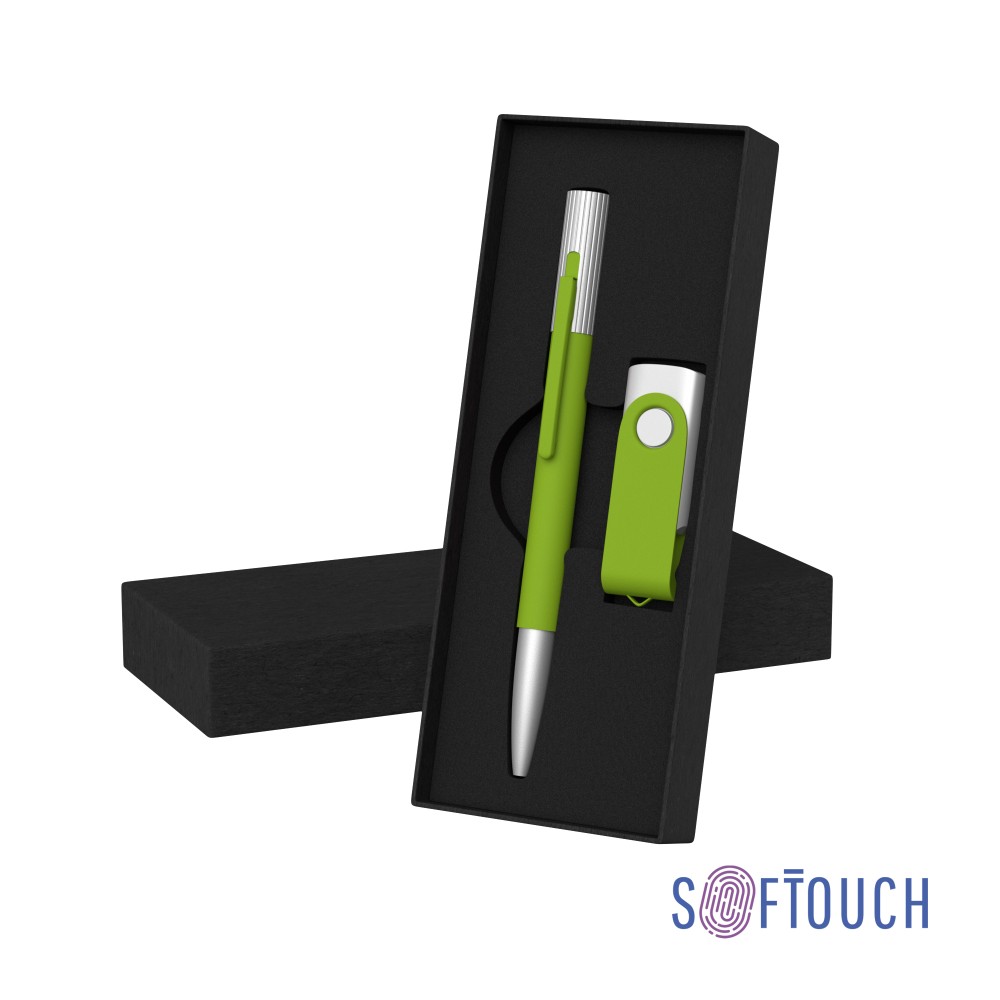 Набор ручка "Clas" + флеш-карта "Vostok" 16 Гб в футляре, оранжевый, покрытие soft touch, зеленое яблоко
