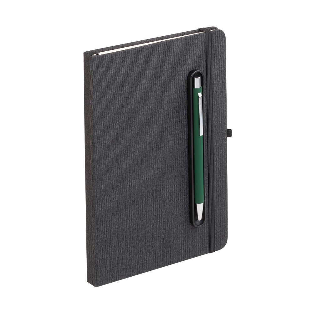 - Блокнот формата А5 с резинкой-фиксатором и встроенным в обложку магнитным держателем для ручки. Внутренний блок состоит из 160 страниц в линейку бумаги плотностью 70 г/м2. Материал обложки изготовлен из переработанного (RPET) пластика. Магниты прочно и надёжно закрепляют металлическую ручку на обложке. Бонус – обложка трансформируется в удобную подставку для смартфона/планшета/ноутбука;