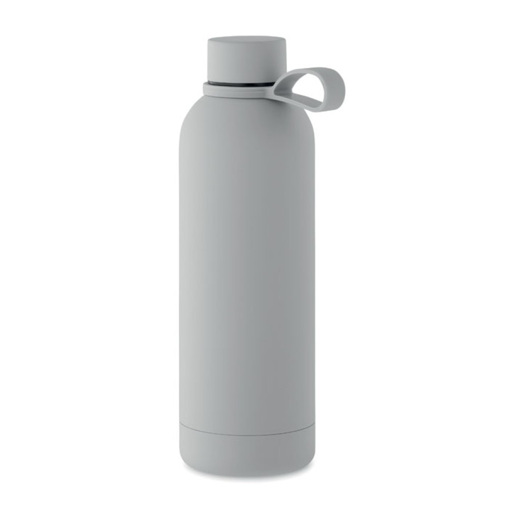 Бутылка с двойными стенками из переработанной нержавеющей стали (90%) и обычной нержавеющей стали (10%) с резиновым покрытием и силиконовым ремешком. Герметична. Объем: 500 мл.