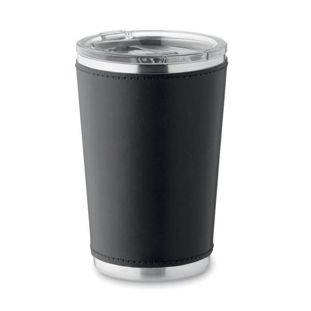 Термокружка с двойными стенками из переработанной нержавеющей стали 90% и 10% нержавеющей стали со съемным чехлом из эко-кожи и пластиковой крышкой. Герметична. Объем: 350 мл.