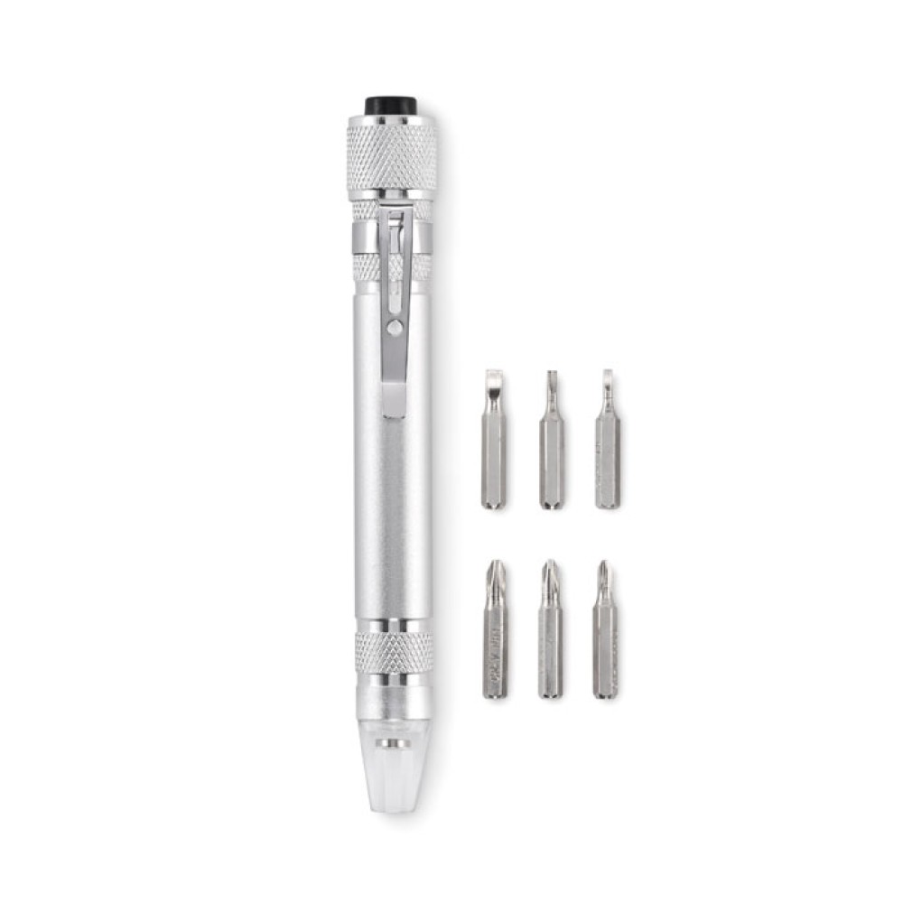 Мультиинструмент из переработанного алюминия в форме ручки с фонариком. Включает 3 шлицевые и 3 крестовые отвертки. В комплект входят 4 батарейки LR41.