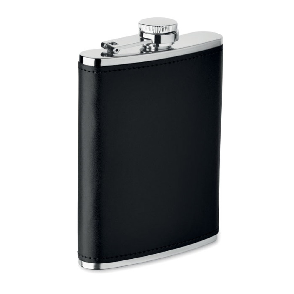 Плоская фляжка из нержавеющей стали с покрытием из искусственной кожи. Объем 200 мл.