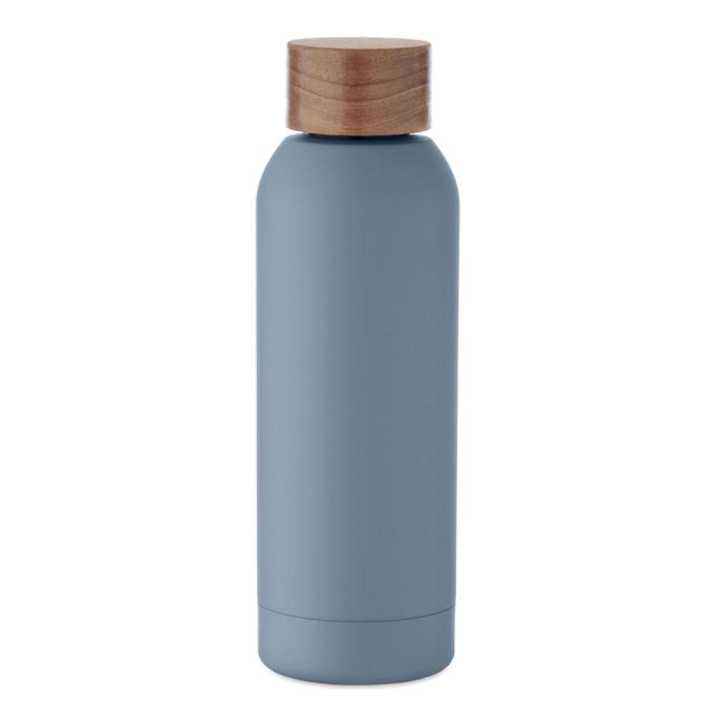 Термобутылка из переработанной нержавеющей стали 90% и 10% нержавеющей стали с резиновым покрытием и крышкой из древесины акации. Герметичная. Емкость: 700 мл. Стенки бутылки могут нагреваться.