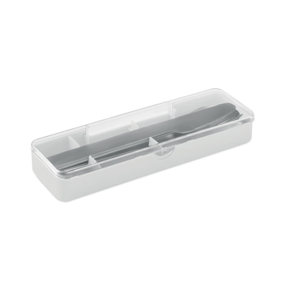 Набор столовых приборов из нержавеющей стали в полипропиленовом футляре. В набор входят вилка, нож и ложка.