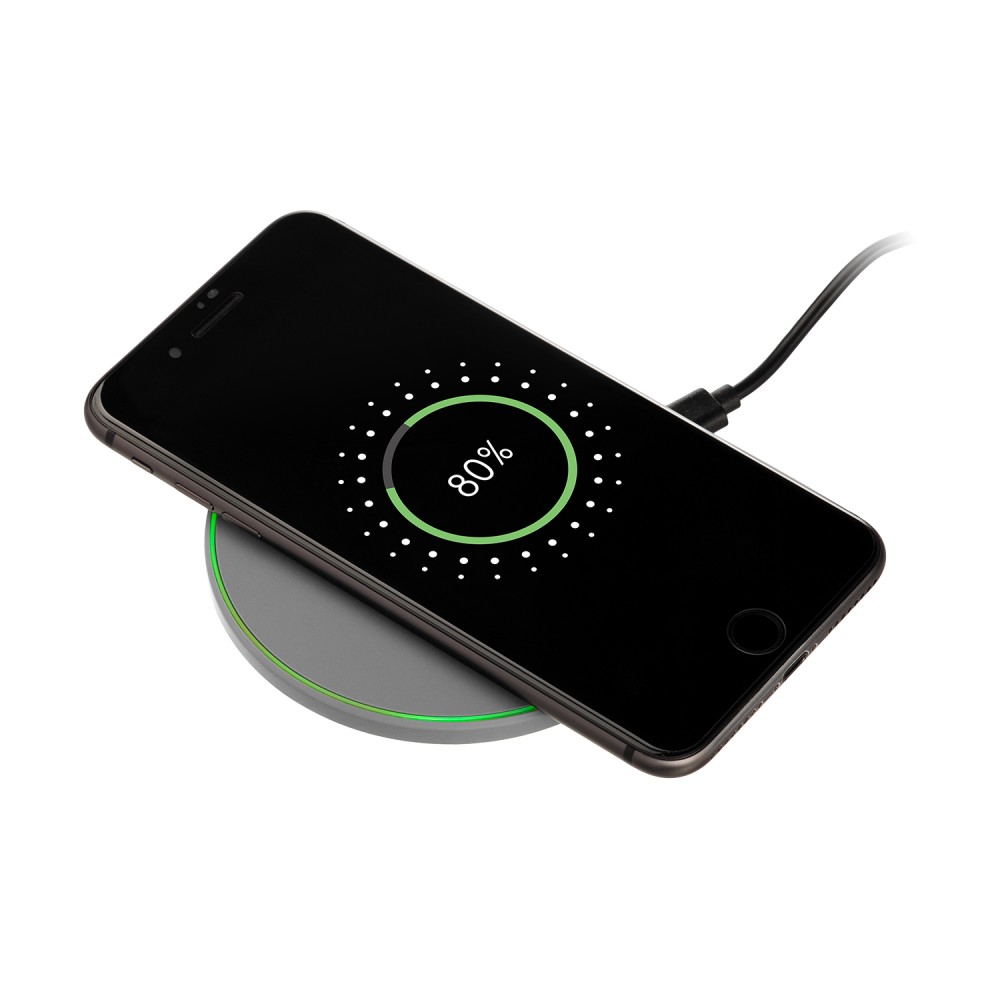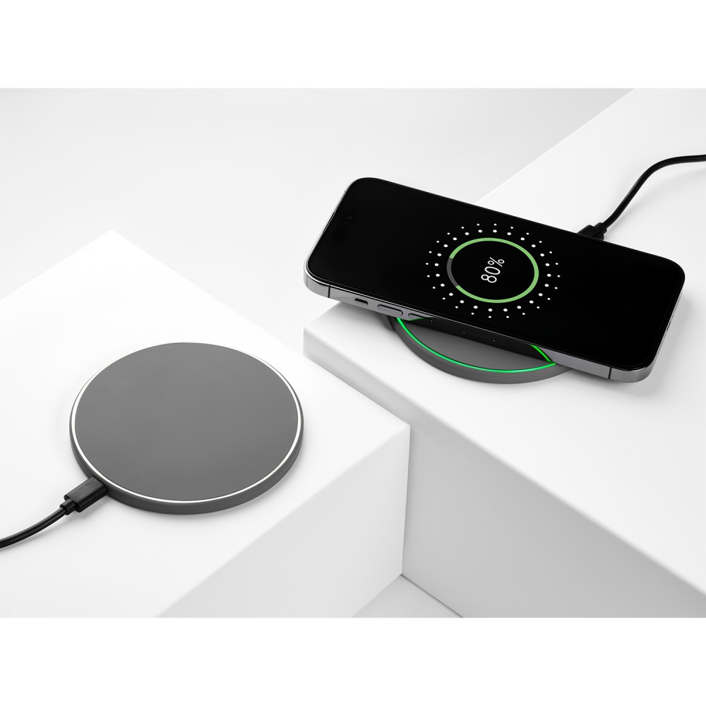 Беспроводное зарядное устройство 15W с подсветкой и покрытием soft-touch. Встроенная LED-панель позволяет создать эффектную подсветку логотипа посредством лазерной гравировки, удачно завершая композицию аксессуара.