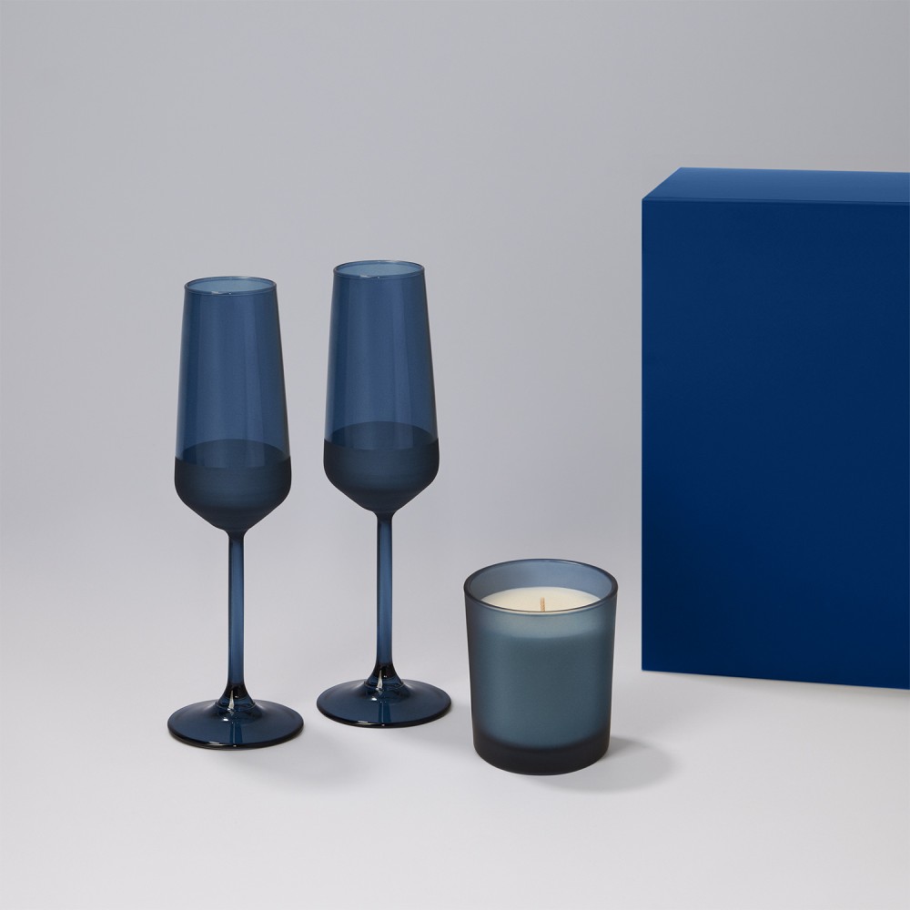 Подарочный набор свеча Энигма (Enigma) + 2 бокала для шампанского Сапфир (Sapphire) в синей коробке