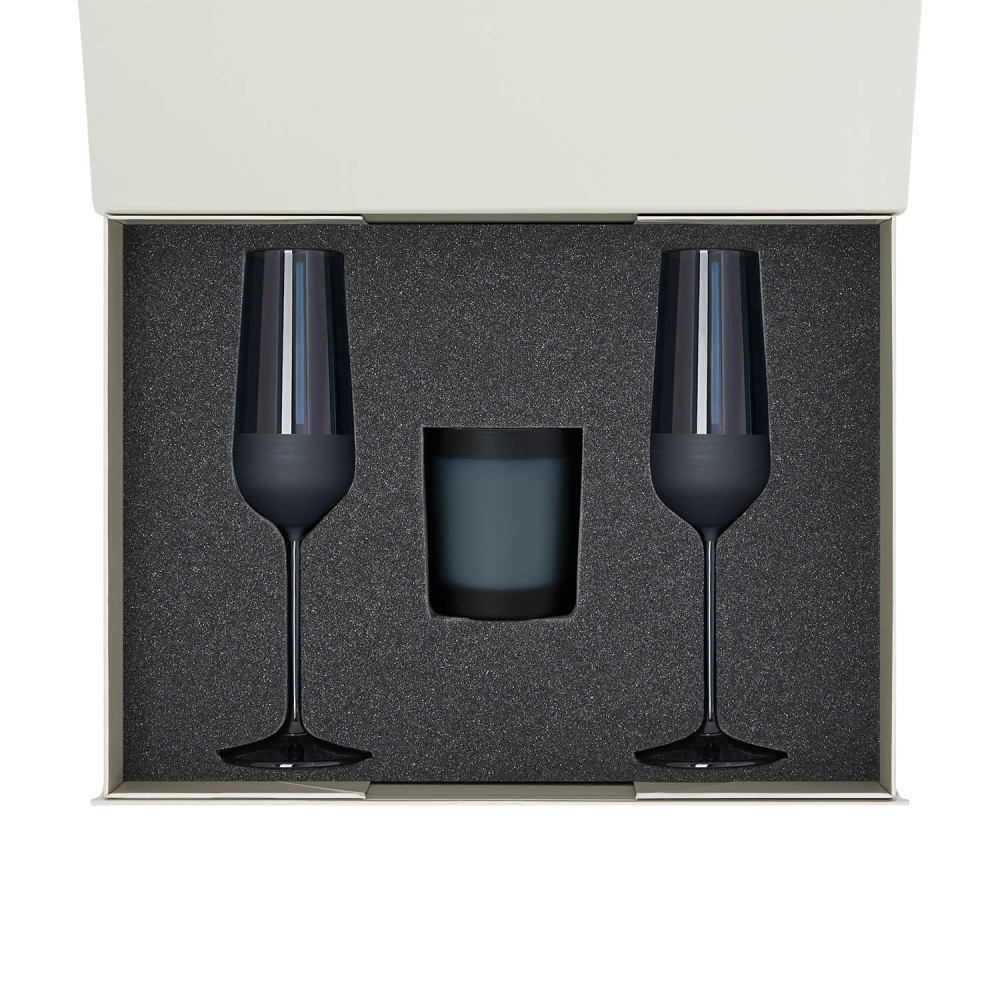 Подарочный набор свеча Энигма (Enigma) + 2 бокала для шампанского Сапфир (Sapphire) в серой коробке