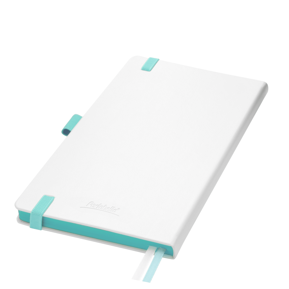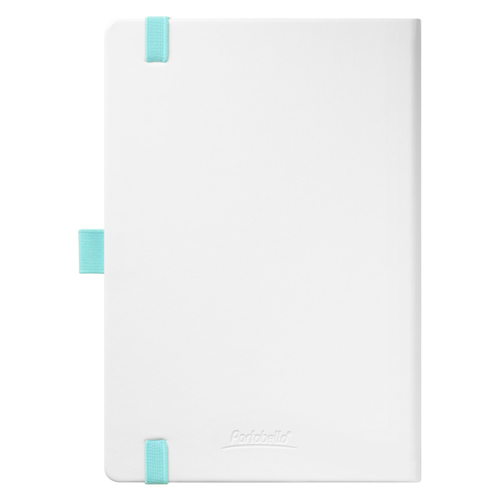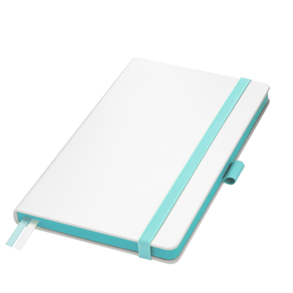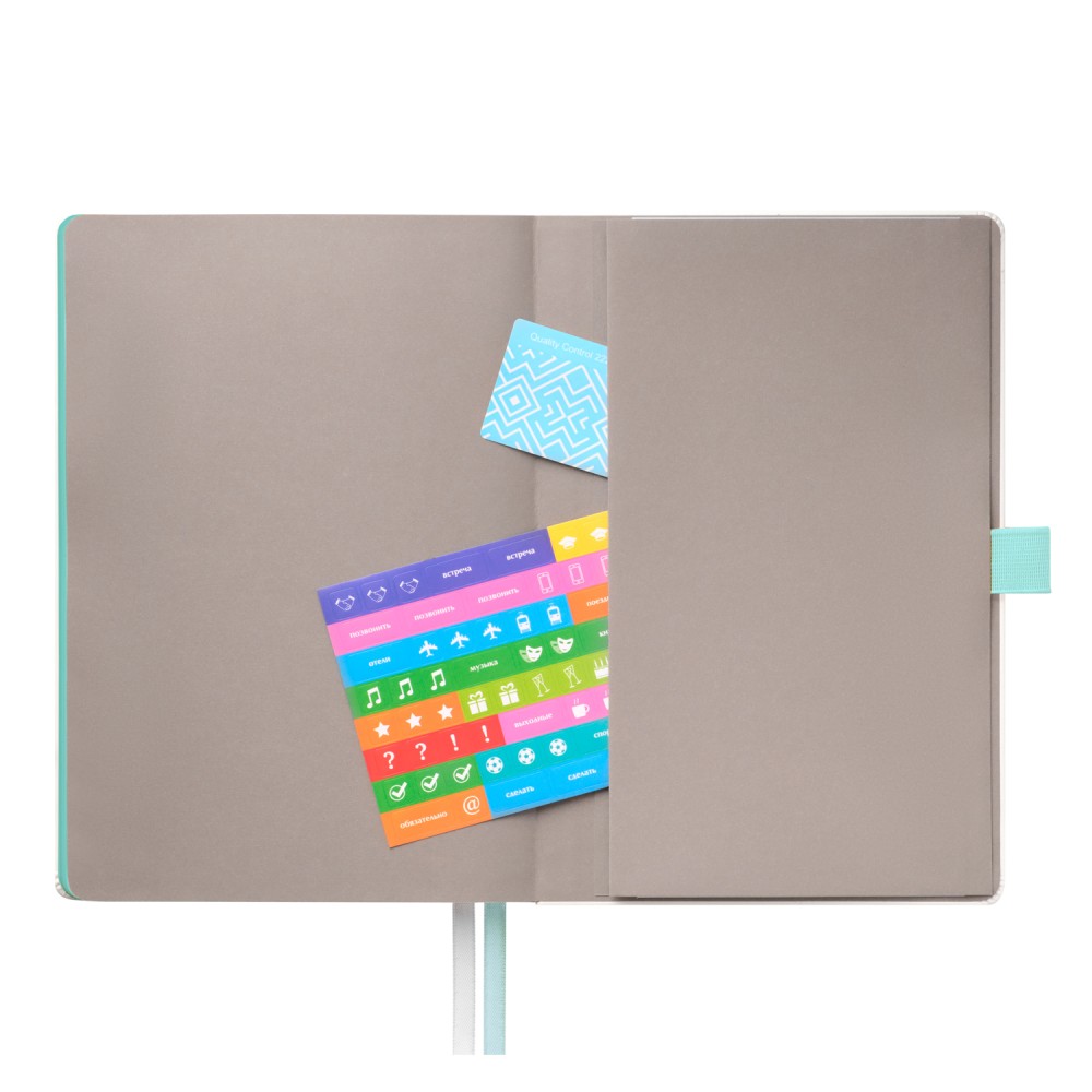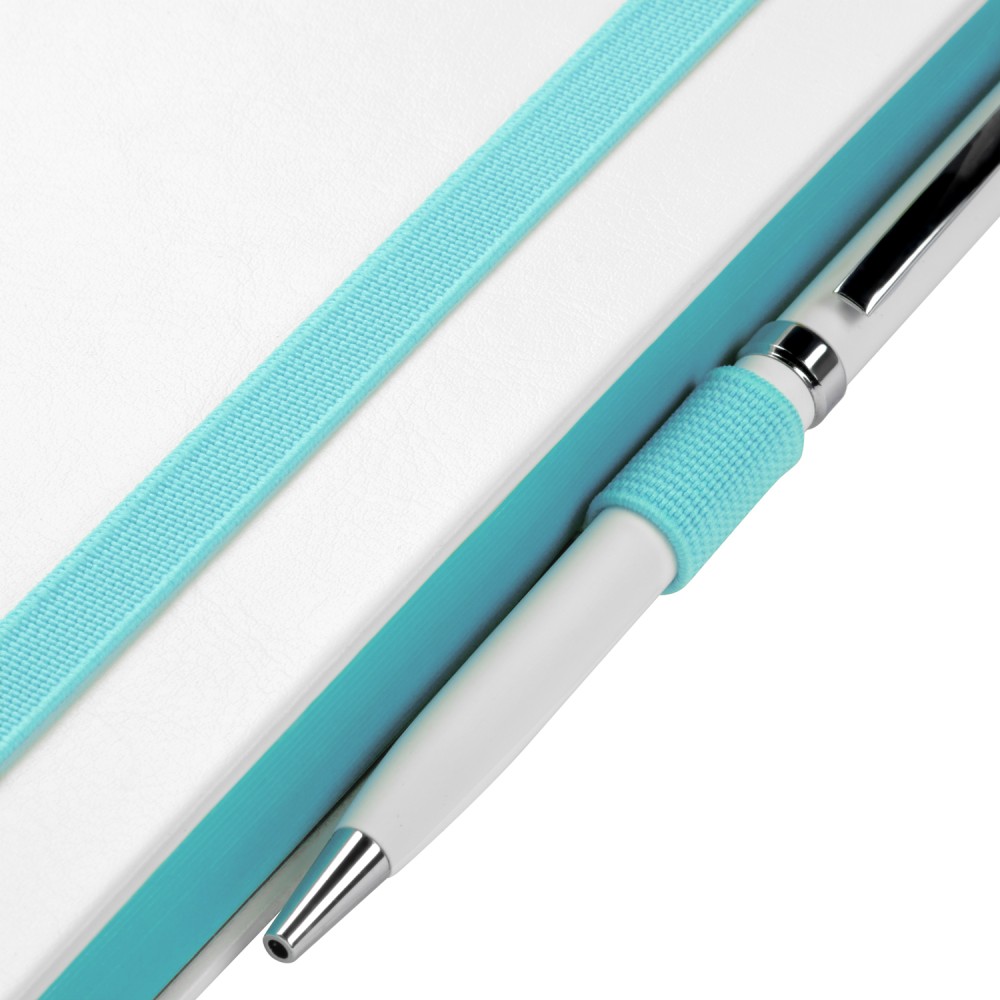 Недатированный ежедневник выполнен в жесткой обложке из искусственной кожи со скругленными уголками. Переплетный материал гладкий, с легкой естественной паутинкой морщин, имеет полуглянцевый блеск. Цвет – чистый белый. Бирюзовые матовые форзац и нахзац, а также бирюзовый срез блока создают оригинальный динамичный цветовой ансамбль и подчеркивают белизну обложки. Страницы светло-кремового цвета, из гладкого офсета, слегка шелковистые, со скругленными уголками. Добавляют изделию мягкую комфортную теплоту. Двойное атласное ляссе составлено из бирюзовой и белой лент. Каждая шириной 6 мм, имеет легкий блеск. Вертикальная фиксирующая резинка прочная, надежная и удобная, в тон срезу. Есть петелька для ручки в тон резинки. Карман на заднем форзаце.