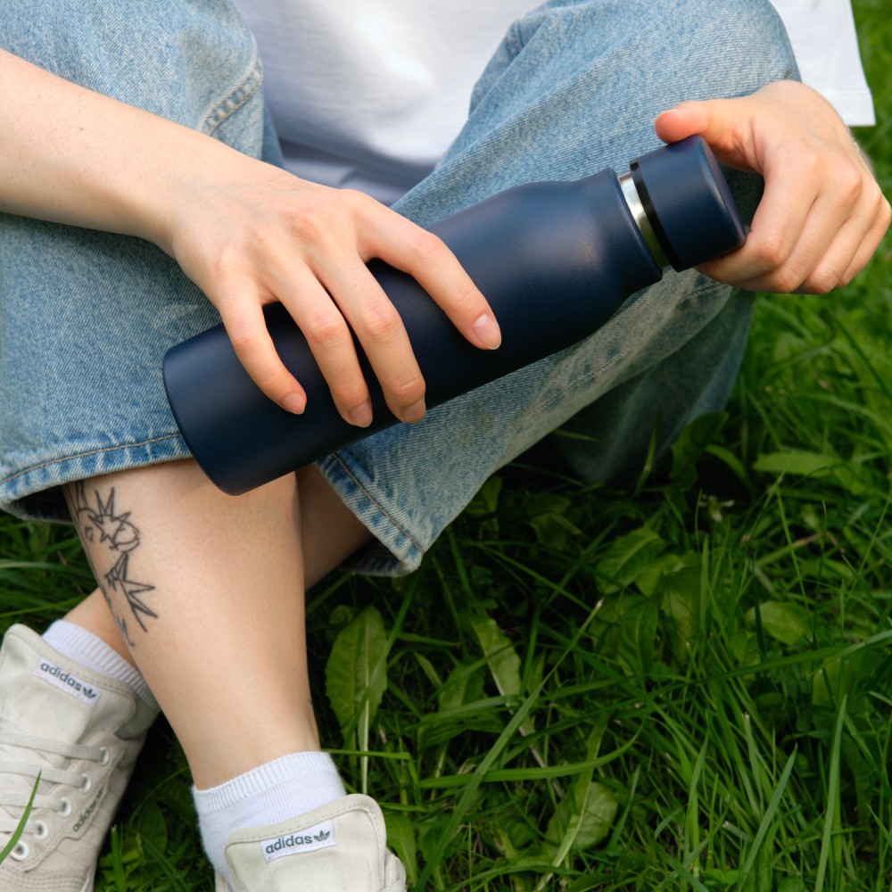 Термобутылку классической формы удобно брать с собой в офис, спортзал, на пробежку или в поход. Крышка в цвет корпуса, полностью литой корпус бутылки, вакуумная герметичная конструкция из двухслойной высоколегированной стали марки 304, порошковое покрытие корпуса и крышки.