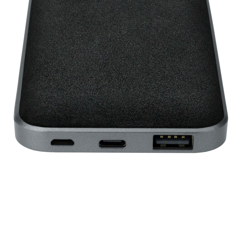 Яркий аккумулятор In Velour - отличная пара ежедневнику одноименной коллекции. Материал устройства приятен к рукам: бархатистая поверхность и плавные линии корпуса дарят комфорт при использовании. Стильный дизайн обеспечивается грамотным сочетанием основных элементов корпуса с боковой панелью. Внешне напоминая велюр, корпус гаджета выполнен в насыщенном бирюзовом цвете, вкрапления которого плавно переходят от темных тонов к более светлым. Боковая панель из пластика серого матового металлика включает в себя индикатор питания, а также порты USB, micro-USB и Type-C. Отделка ПУ добавляет изделию новый вариант персонализации – тиснение в дополнение к УФ печати, конструкция аккумулятора позволяет использовать обе стороны для персонализации, что дает новые возможности для воплощения идеи дизайна.