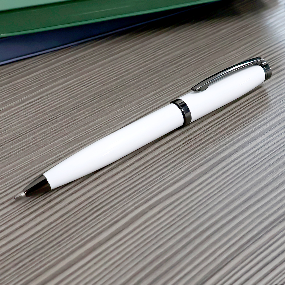 Наша Бетти — подарок для любителей более увесистых и солидных форм. Общий вес ручки — 33 грамма! У нашей красотки поворотный механизм, покрытый глянцем корпус из нержавеющей стали, стержень Паркер 0,7 мм с синими чернилами. Элементы ручки: клип, кольцо и дюбка покрыты ган-метал краской. Ручку приятно держать в руке и демонстрировать публике.