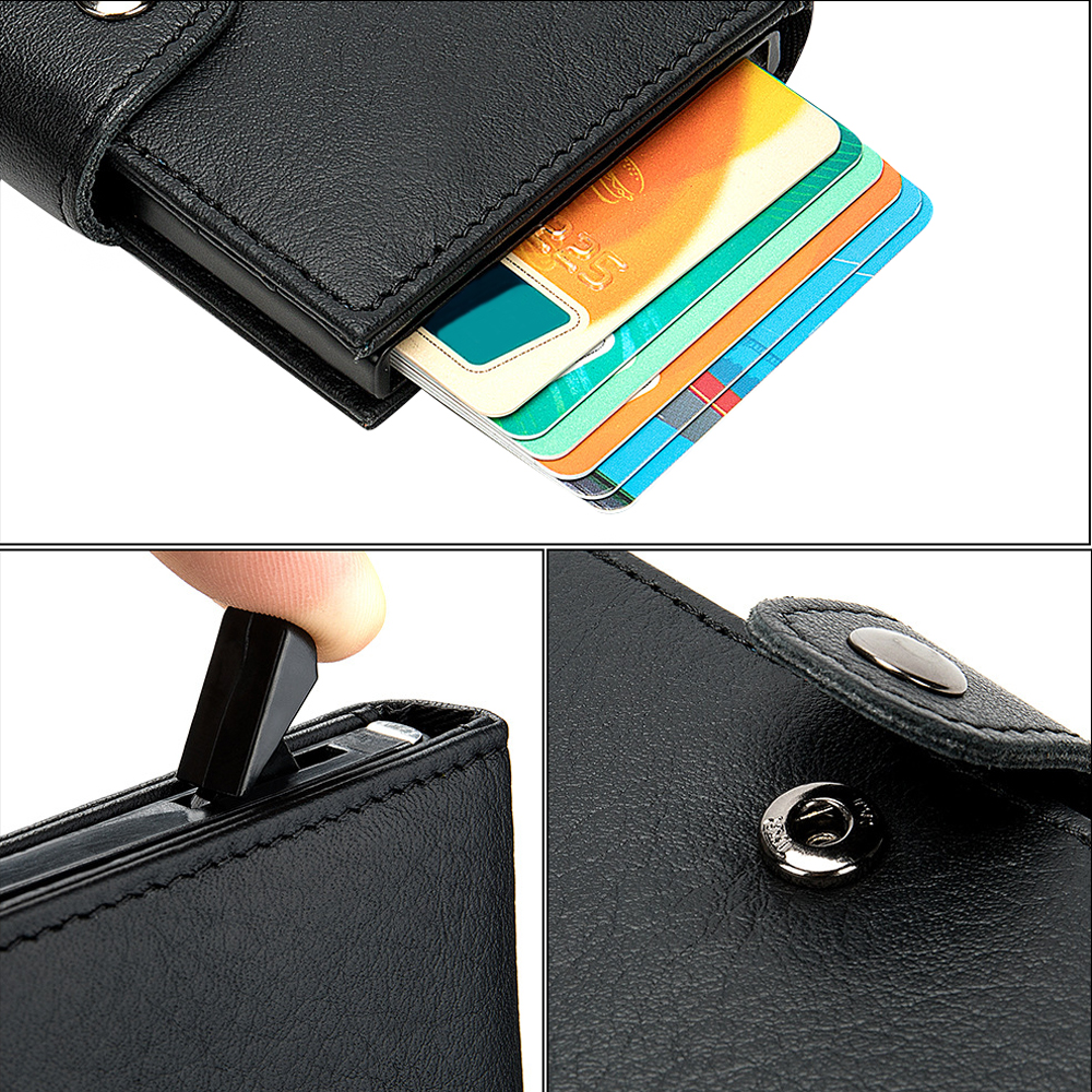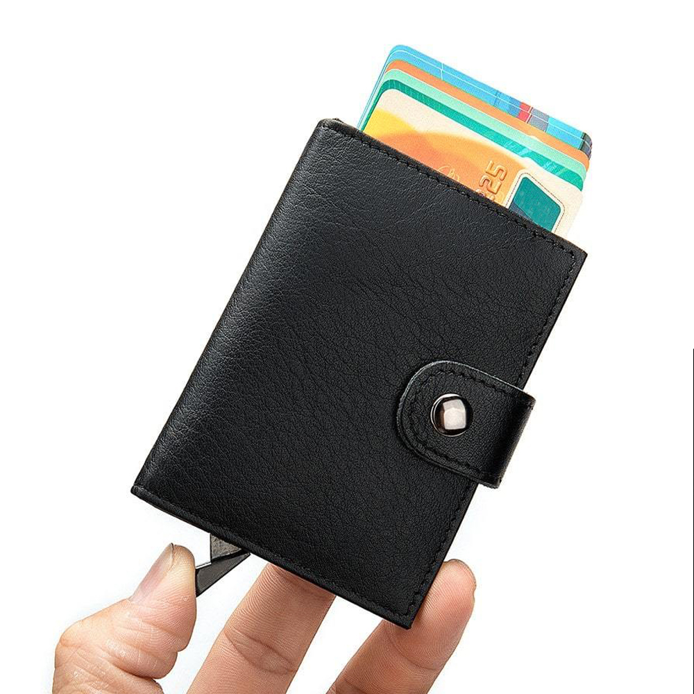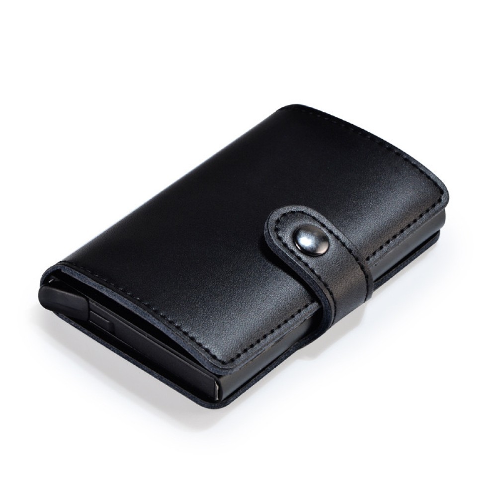 Солидный практичный держатель для банковских карт Bakara с покрытием из экокожи книжного типа и возможностью закрывать, а также функцией RFID, чтобы защитить карты он несанкционированного копирования. Имеет нижнюю кнопку для быстрого извлечения карт.