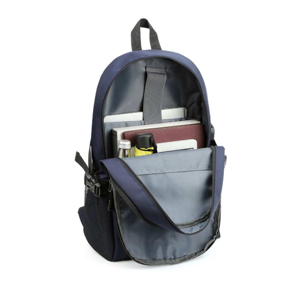 Сбоку USB-разъем с проводом для подключения внешнего аккумулятора, который при необходимости можно спрятать под небольшой молнией внутри и два объёмных кармана с вентилируемой сеткой и регулируемыми тесьмами-стяжками на защёлках-фастексах которые существенно расширяют функционал и вместимость рюкзака.