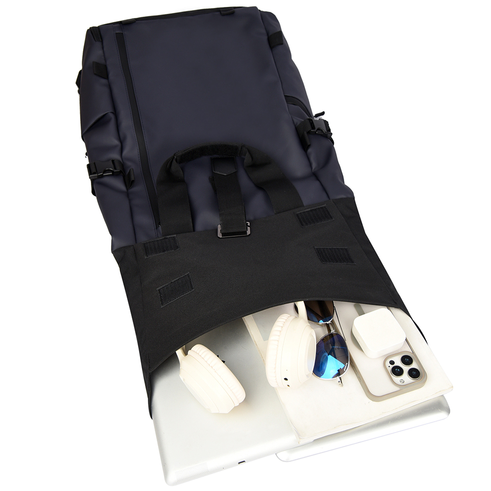 Первый, сверху - укреплённый пластиком край рюкзака фиксируется липучками-велькро и регулируемым по длине ремеём с металлической застёжкой с возможностью увеличкения и фиксации объёма на пяти уровнях,