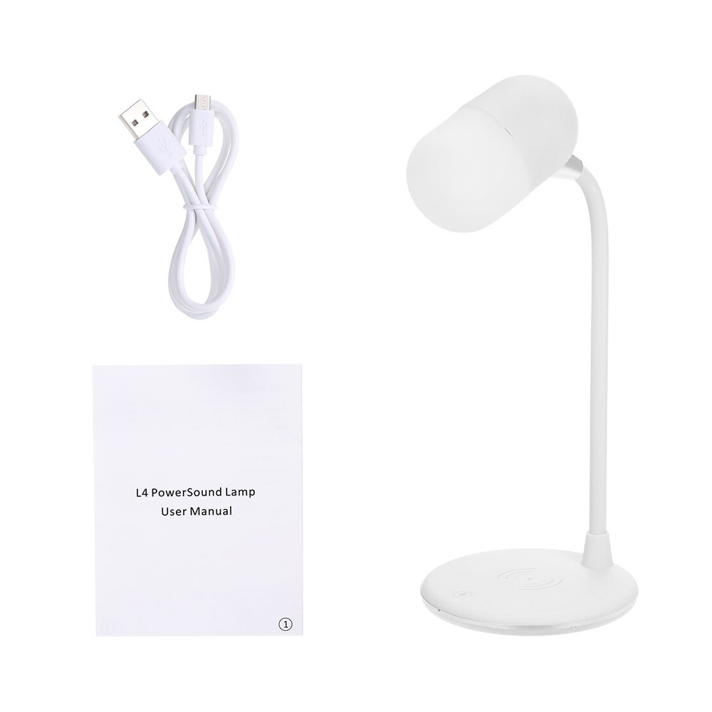Настольная лампа с колонкой и беспроводной зарядкой Alladin. Тип светодиодного индикатора: cветодиодная панель (яркость 28LM±2), три режима настройки света (яркий, теплый, холодный), 7 светодиодов. Мощность беспроводной зарядки: 5 Вт. Максимальная мощность беспроводного зарядного устройства: 5/10 Вт (опционально). Мощность динамика: 3 Вт. Вход:5V/3A. Версия Bluetooth: V5.0. В комплекте кабель USB и инструкция.