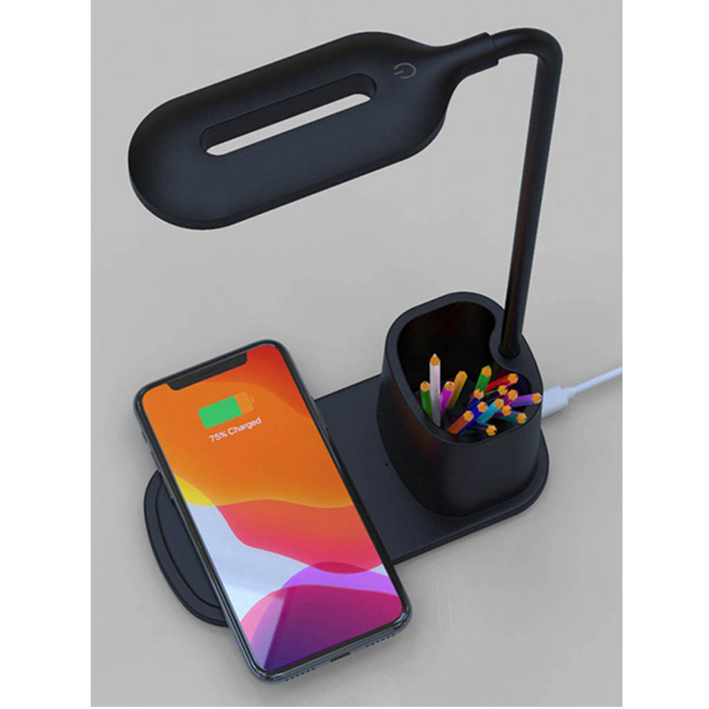 Практичная настольная лампа Tenza для использования в офисе и доме. Стильный лаконичный дизайн и гибкое поворотное регулирование лампы удобно в использовании как на офисном столе, так и прикроватной тумбе. Возможность выбирать степень яркости света несомненный плюс. Держатель для ручек дополняет функциональность. И безусловный лидер популярности – это функция беспроводной зарядки Qi. Тип лампы LED (0.5 x 20 световых диодов. Цветовая температура 3000-6000К). Беспроводная зарядка 10W. Питание: 5V/2A / 100~240V/50-60Hz. В комплекте кабель USB и инструкция. Размер в упаковке: 8,3*11*20,5 см