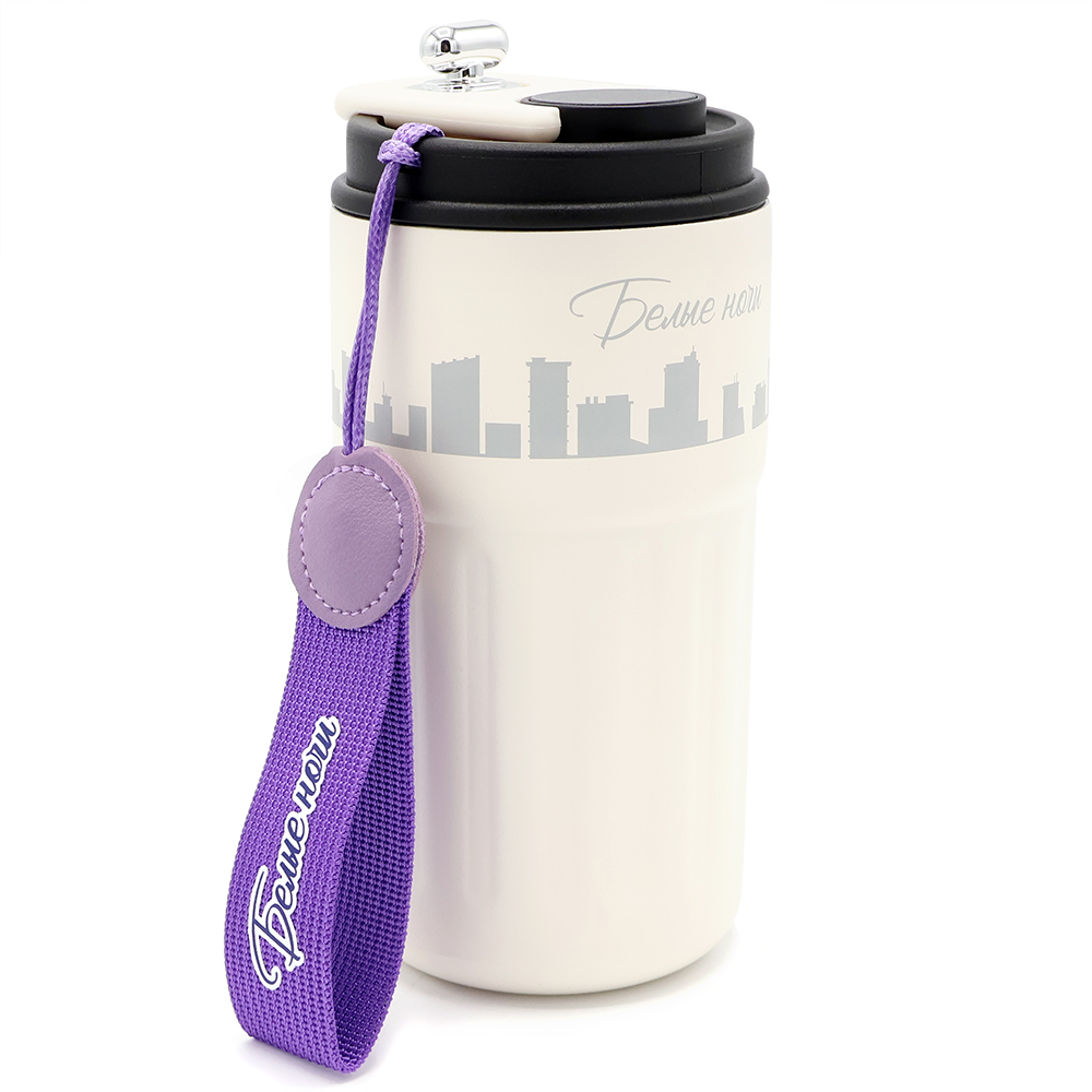 Термокружка подходит для большинства автомобильных подстаканников. Цвет шнурка, максимально близкий к пантону 2077С, цвет накладки максимально близкий к пантону 2226С.