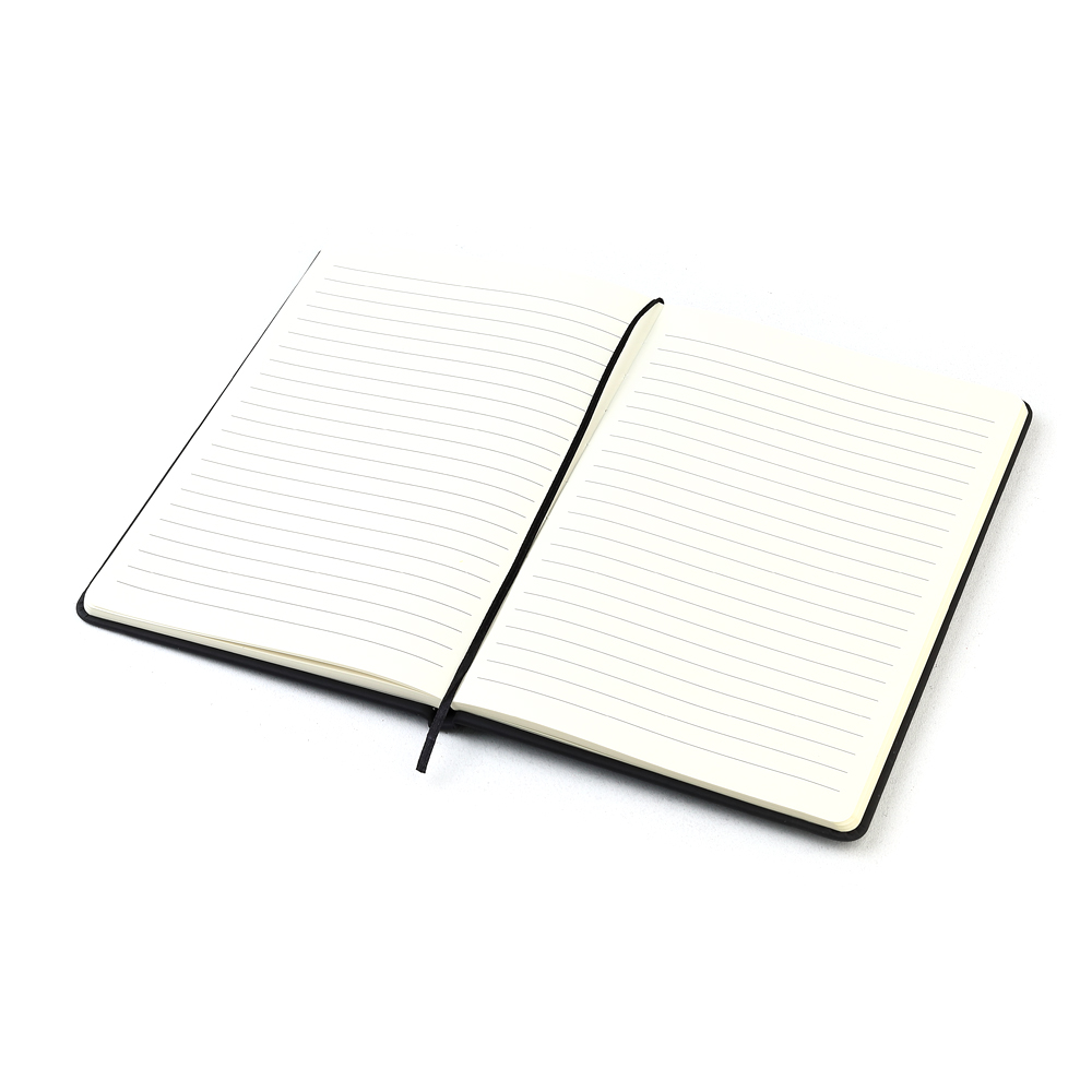 Блокнот формата А5 с твердым покрытием из PU-материала с имитацией рисунка кожи, с эластичной застежкой для закрытия и текстильной закладкой в цвет блокнота, 192 страницы / 96 листов, плотность 70г/м, страницы с черными линиями.