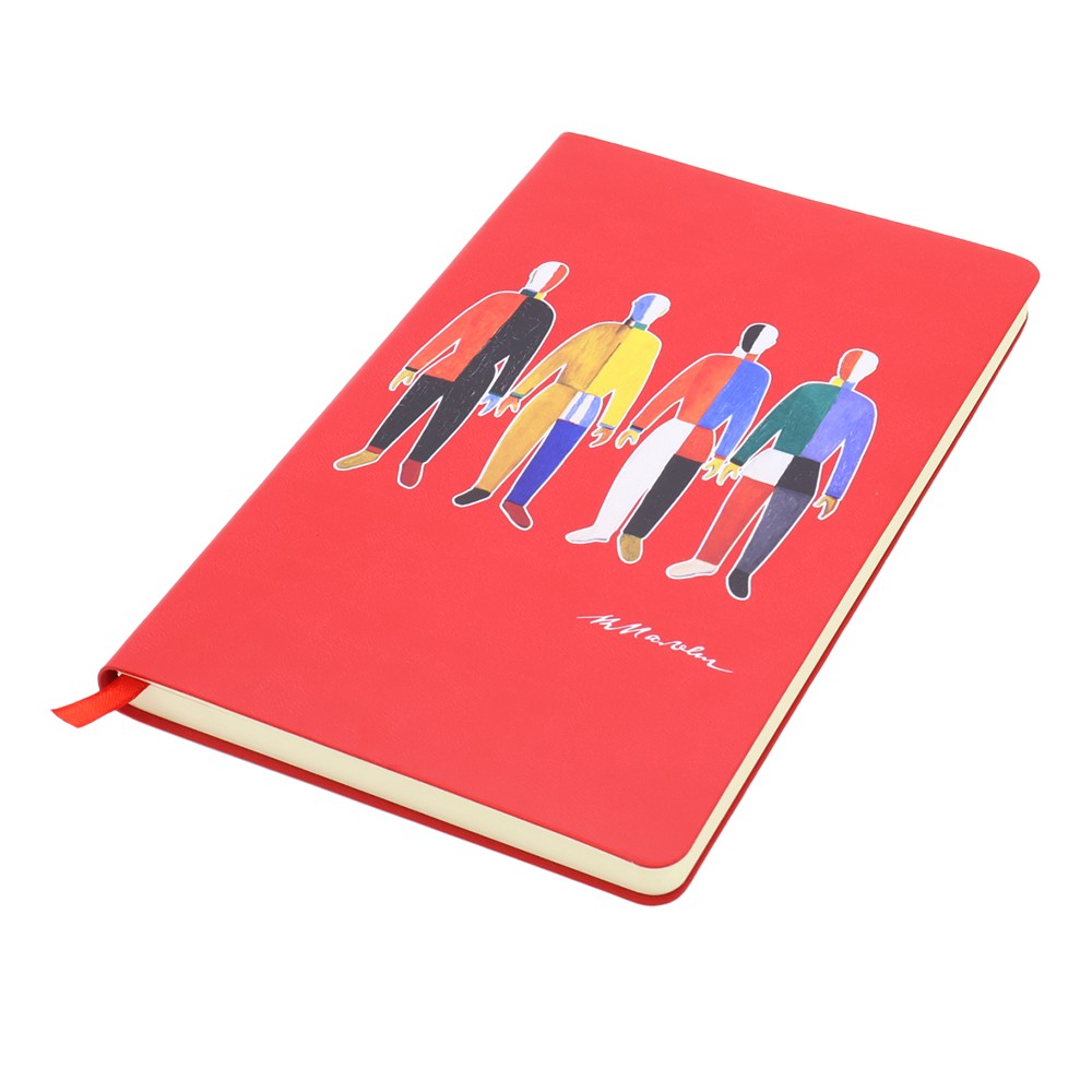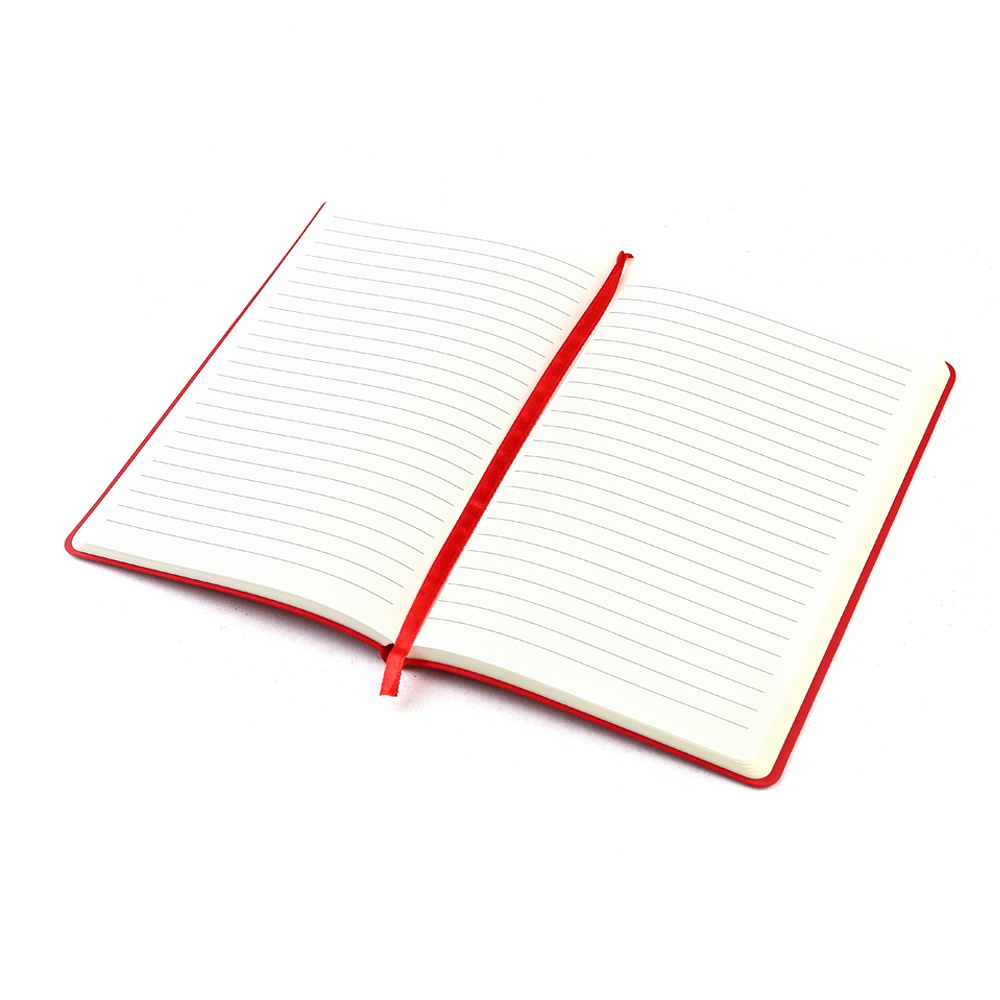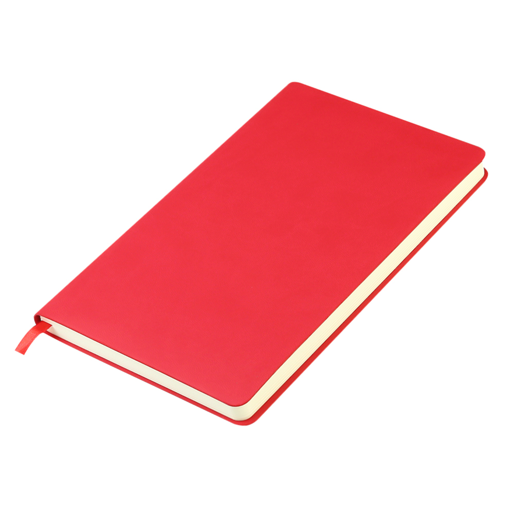 Блокнот формата А5 с мягкой обложкой из PU-материала, имеющего текстуру, имитирующую поверхность натуральной кожи; с текстильной закладкой в цвет блокнота, 256 страниц, плотность 70г/м, страницы с черными линиями. Цвет по PANTONE® (максимально приближен): 186C.