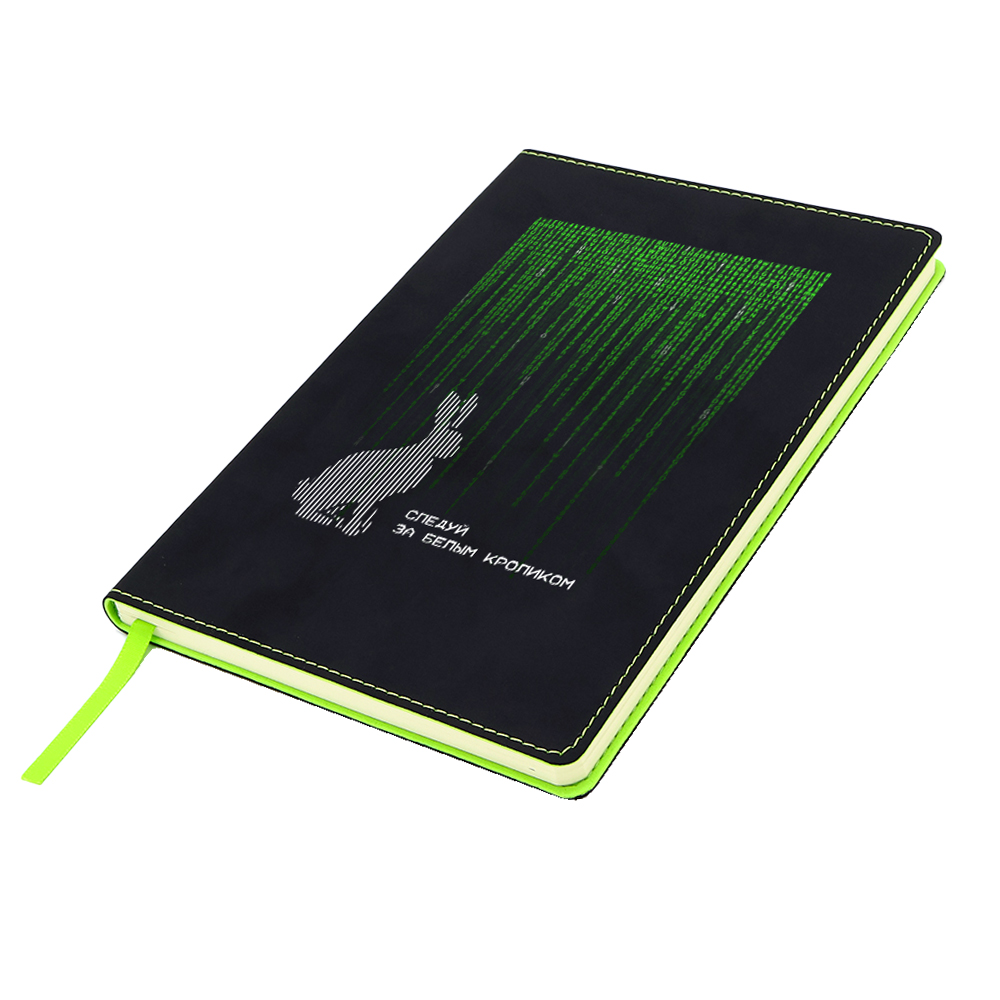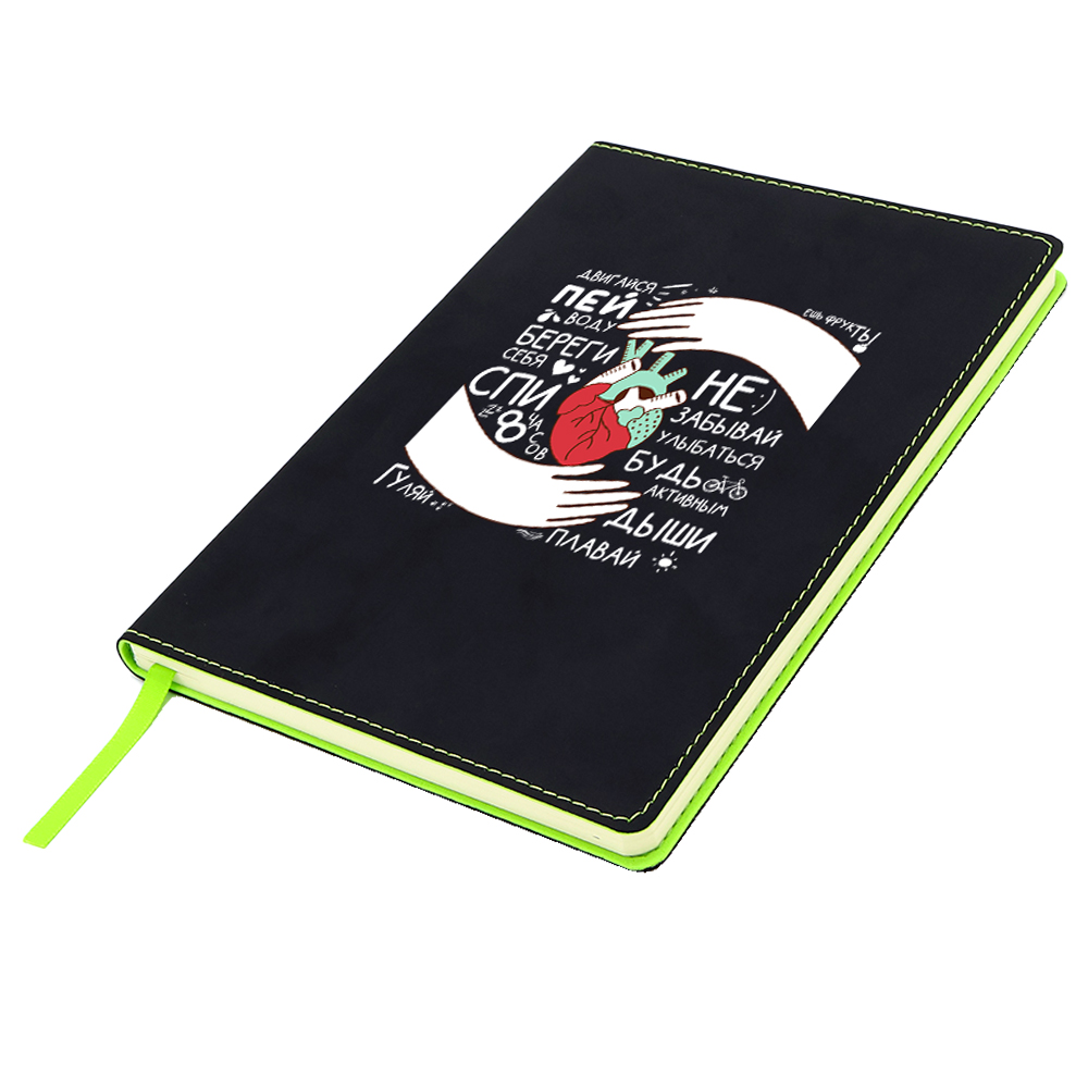Блонот формата А5 в мягкой обложке из искусственной кожи. Материал обложки - термополиуретан. Основной цвет - чёрный; строчка по периметру, внутенний край и ляссе - зелёного цвета. Размеры: 214*144мм, 80 листов, разлинееные страницы, бумага плотностью 80г/м2.