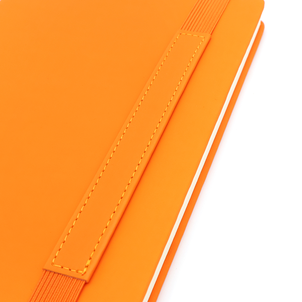 Блокнот формата А5 в твёрдой обложке из искусственной кожи. Материал обложки — термополиуретан, текстура — гладкая. Из особенностей: широкая эластичная застёжка со вставкой из кожзама. На неё можно нанести логотип либо слоган вашей компании.