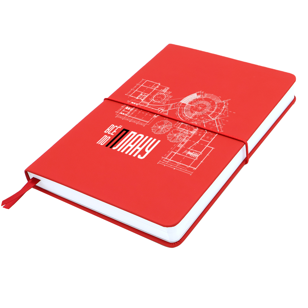 Блокнот А5-формата жёсткой обложке со специальным гладким покрытием. Материал обложки — полиуретан. Карман в нахзаце, форзац, двойное ляссе, эластичная застёжка — всё комплиментарно цвету обложки.
