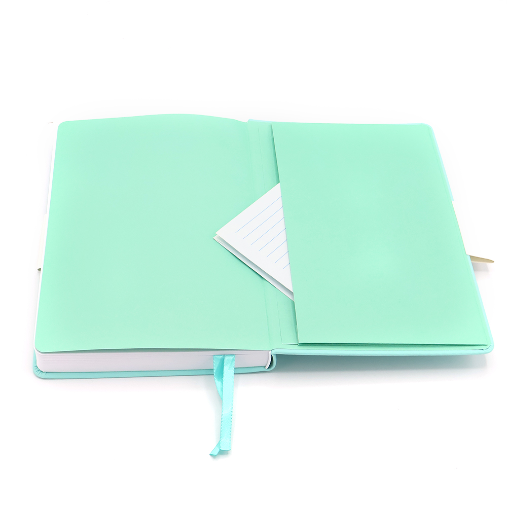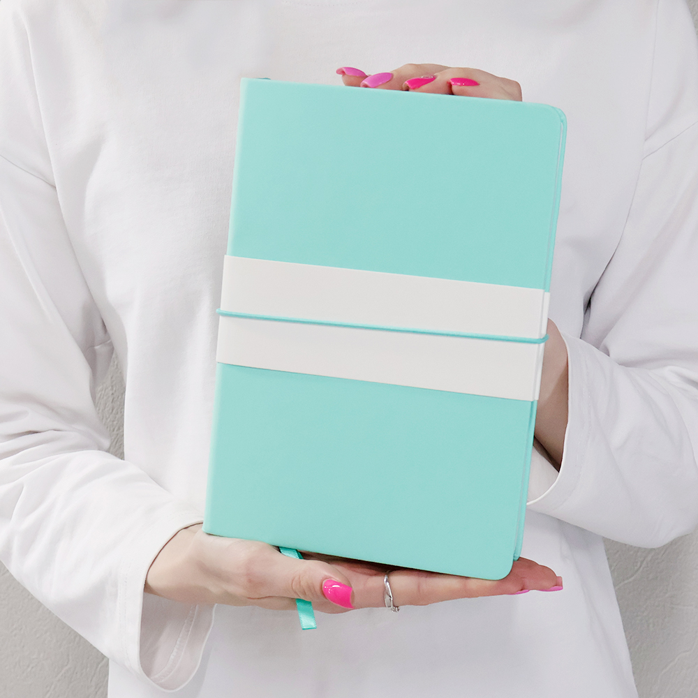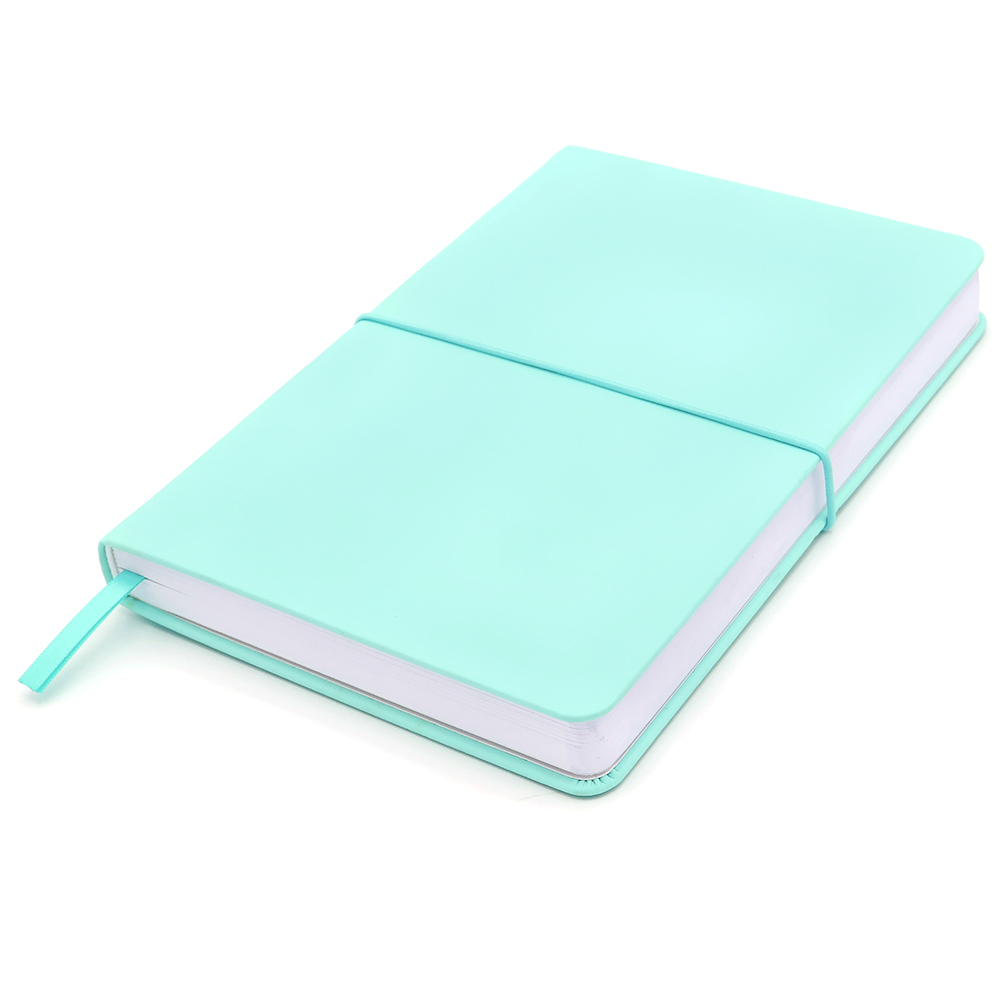 Блокнот А5-формата жёсткой обложке со специальным гладким покрытием. Материал обложки — полиуретан. Карман в нахзаце, форзац, двойное ляссе, эластичная застёжка — всё комплиментарно цвету обложки.
