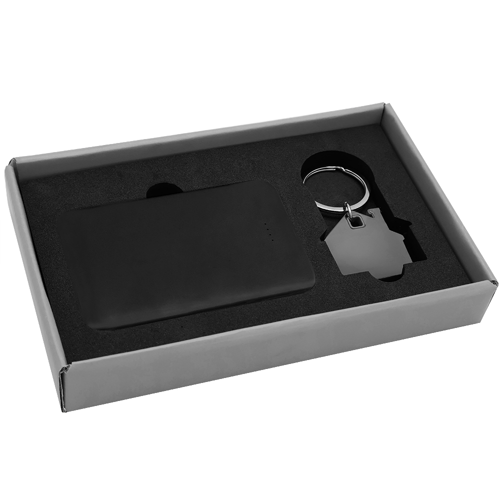 Подарочный набор в элегантной цветной картонной коробке серого цвета с конструкцией крышка-дно. Внутри расположены аккуратно закрепленные на ложементе внешний аккумулятор емкостью 5000 mAh и металлический карманный брелок. Внешний аккумулятор обладает компактным дизайном и обеспечивает надежный запас энергии для мобильных устройств в пути, а стильный металлический брелок станет практичным и эстетичным аксессуаром для ключей. Этот набор идеально подходит в качестве презента для тех, кто ценит удобство, качество и современный стиль.