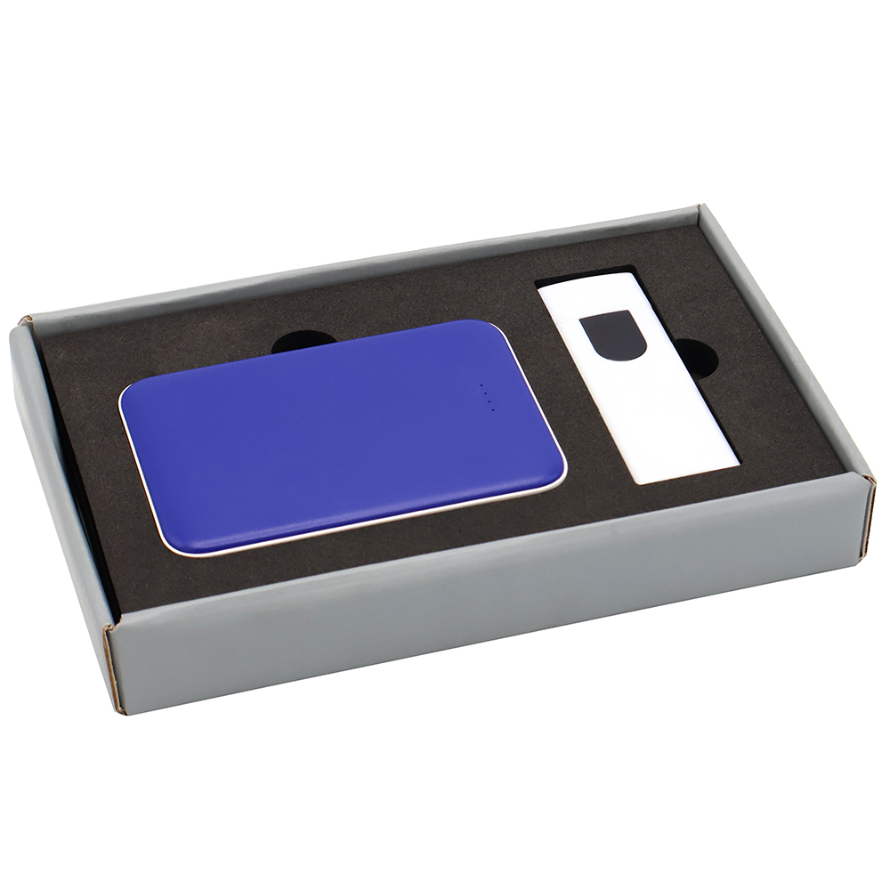 Подарочный набор в стильной цветной картонной коробке серого цвета (крышкой-дно). Внутри на аккуратном ложементе расположены внешний аккумулятор емкостью 5000 mAh и электронная зажигалка. Компактный и мощный внешний аккумулятор обеспечивает надежное подзаряжание мобильных устройств в любое время, а современная электронная зажигалка сочетает в себе удобство и безопасное использование без огня. Этот набор станет практичным и элегантным подарком для людей, ценящих функциональность и стиль.