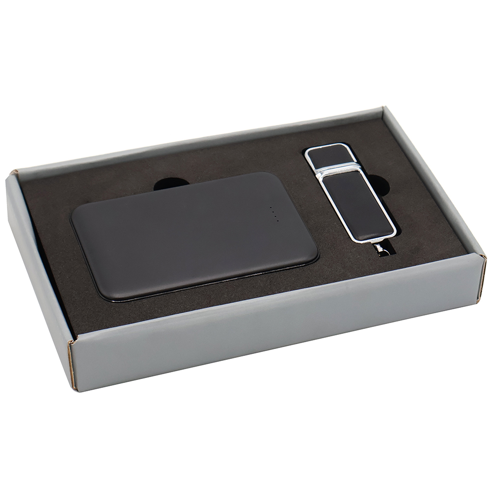 Подарочный набор в стильной цветной картонной коробке серого цвета с конструкцией крышка-дно. Внутри на аккуратном ложементе расположены внешний аккумулятор емкостью 5 000 mAh и элегантная флешка объемом 16 ГБ в корпусе с вставками из искусственной кожи. Мощный аккумулятор обеспечивает быстрое и надежное питание мобильных устройств, а флешка в изысканном дизайне сочетает вместительность с темой премиального стиля, надежно сохраняя ваши цифровые файлы. Такой набор станет стильным и практичным подарком для деловых и активных людей, ценящих качество и эстетичность.