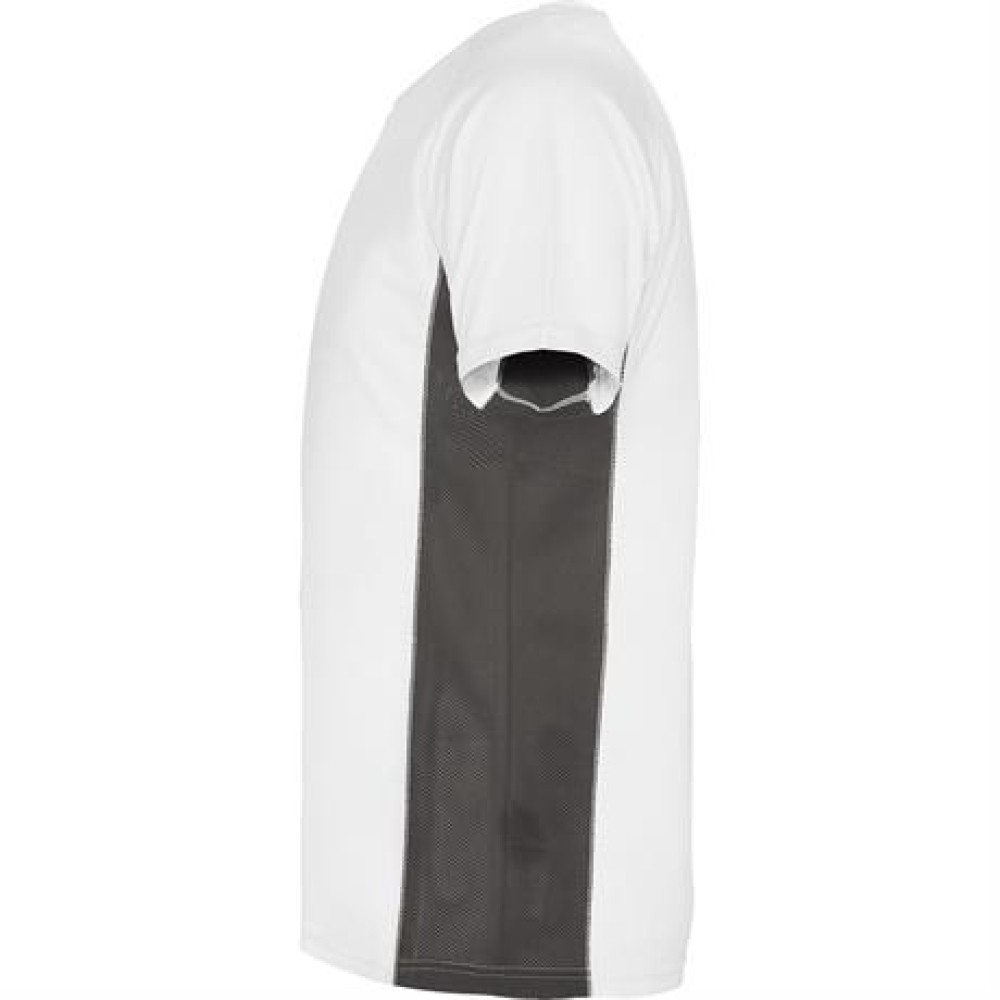 Спортивная футболка с короткими рукавами реглан, изготовленная из двух комбинированных тканей из полиэстера. Основная ткань — ткань bird's eye, а боковые вставки и рукав с внутренней стороны — с микроперфорированной ткани. Круглая горловина с усиленными