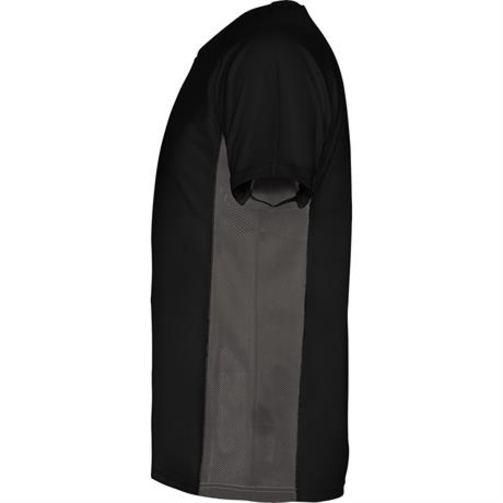 Спортивная футболка с короткими рукавами реглан, изготовленная из двух комбинированных тканей из полиэстера. Основная ткань — ткань bird's eye, а боковые вставки и рукав с внутренней стороны — с микроперфорированной ткани. Круглая горловина с усиленными
