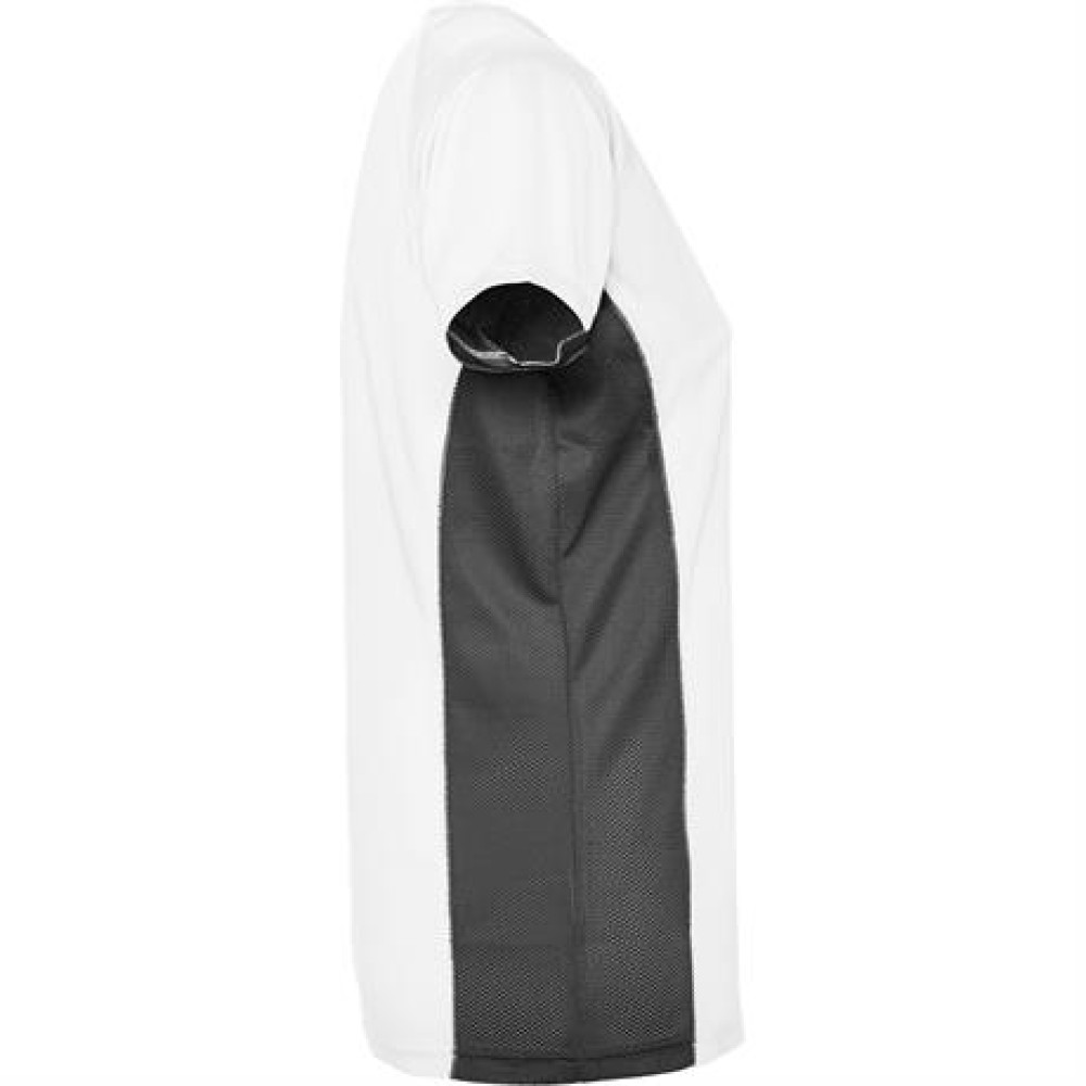 Спортивная футболка с короткими рукавами реглан, изготовленная из двух комбинированных тканей из полиэстера. Основная ткань — ткань bird's eye, а боковые вставки и рукав с внутренней стороны — с микроперфорированной ткани. Круглая горловина с усиленными