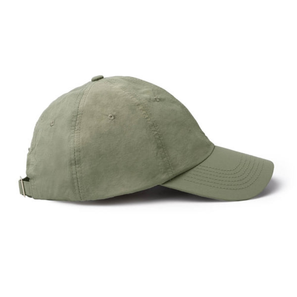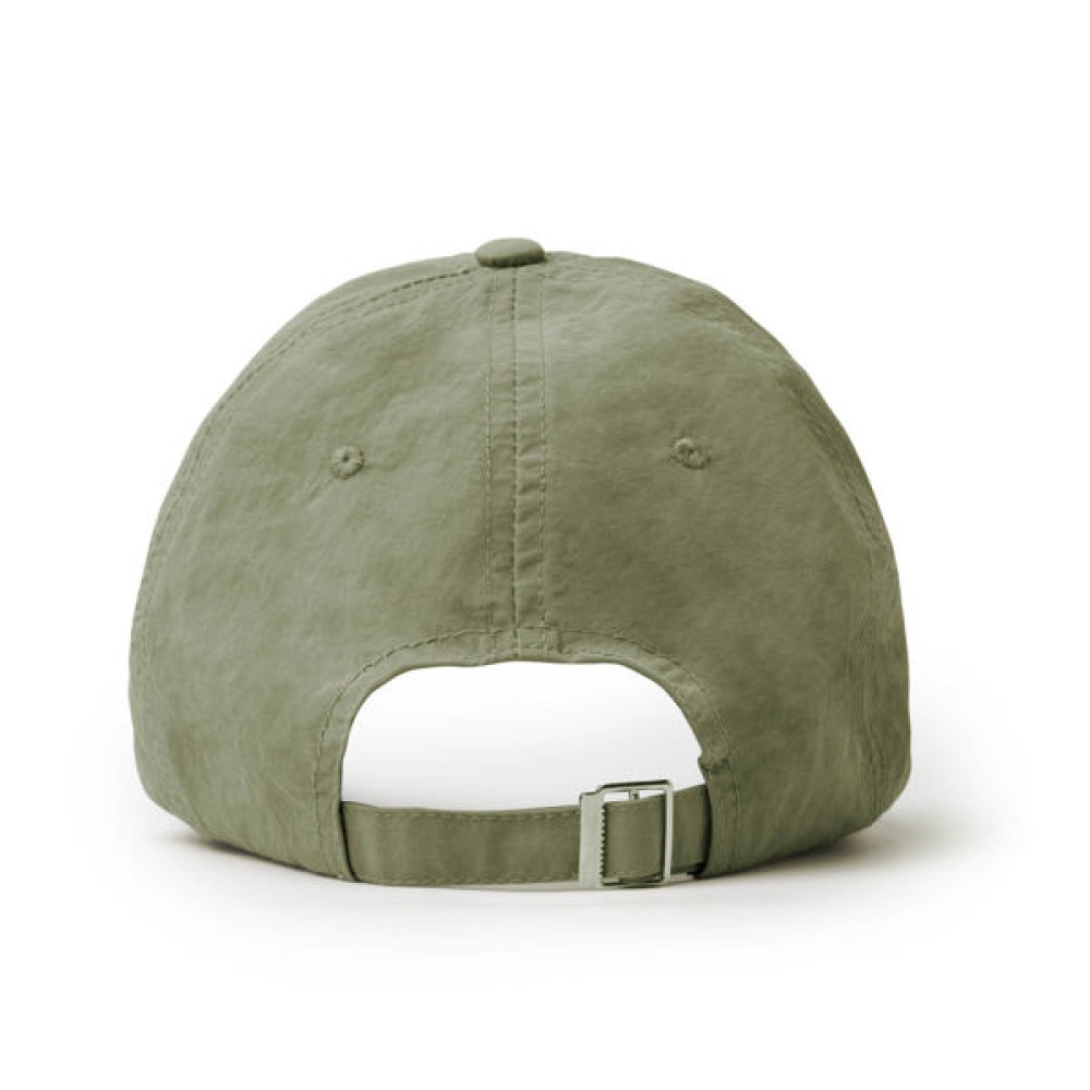 Бейсболка изготовлена из 100% нейлона, состоящего из 6 панелей. Имеет внутреннюю влагоотводящую ленту по периметру. Также оснащена шестью вышитыми люверсами (по одному на каждой панели), шестью прошитыми линиями на козырьке и регулируемой застежкой с металлической пряжкой сзади.