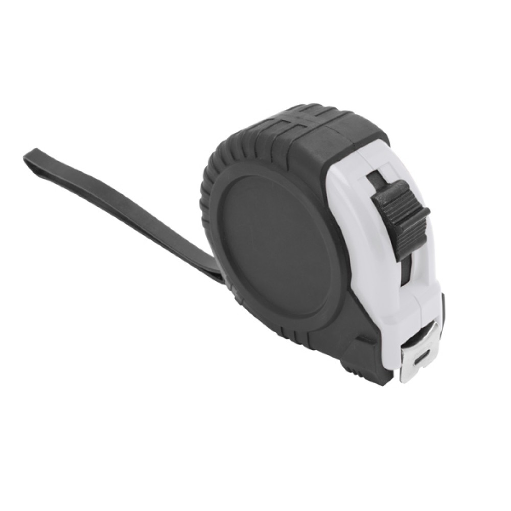 Рулетка / флексометр длиной 3 м с блокирующим механизмом и металлическим крючком для ленты. Корпус из цветной резины, металлическая клипса и ремень для переноски.