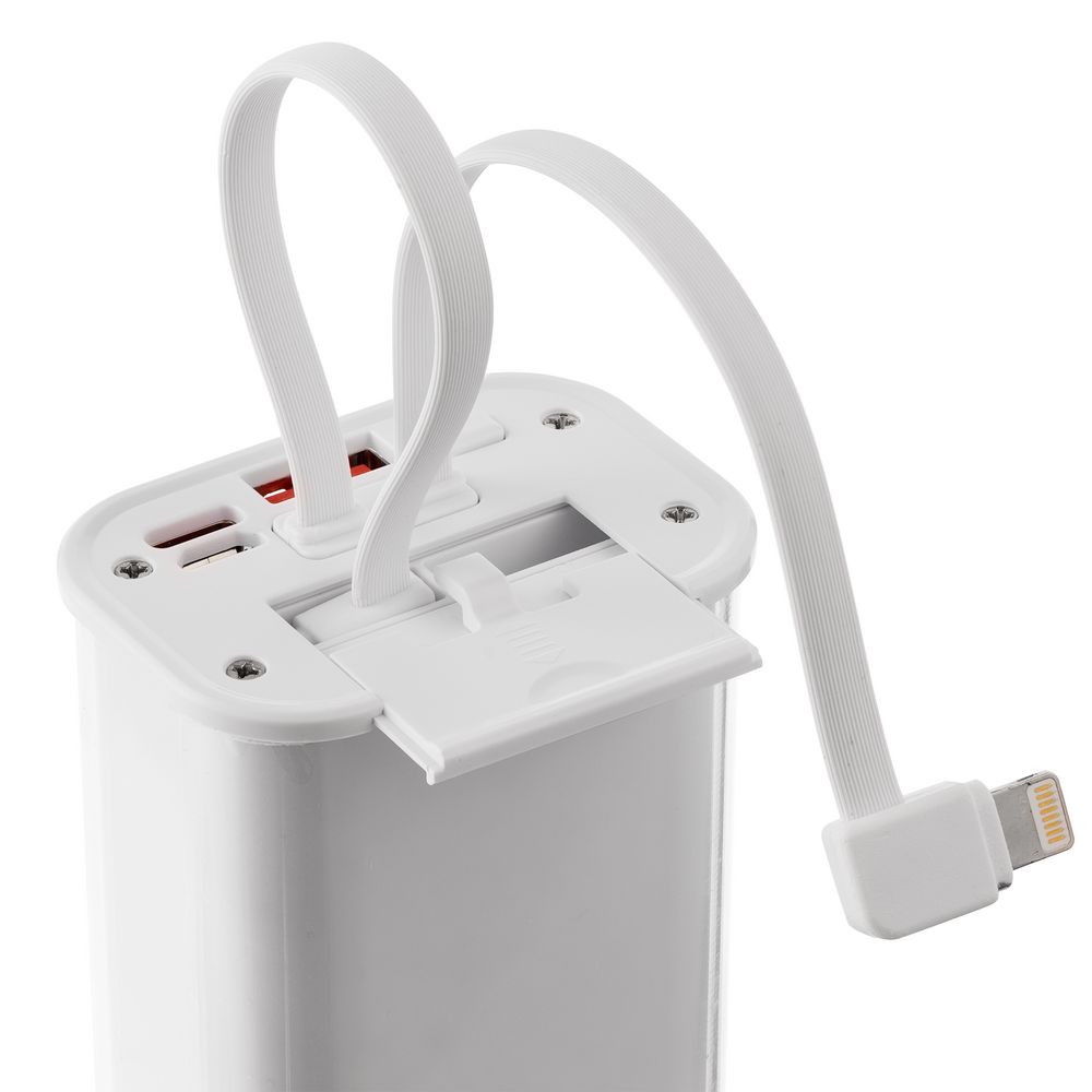 Встроенные кабели позволяют заряжать устройства с разъемами USB Type-C и Lightning.