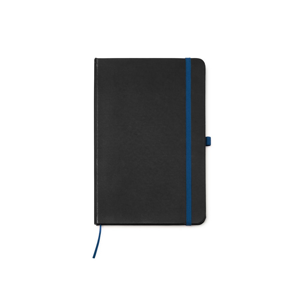 Блокнот формата А5 в твердой обложке из черного полиуретана. Цветная закладка, резинка и держатель для ручки. 80 листов в линейку.