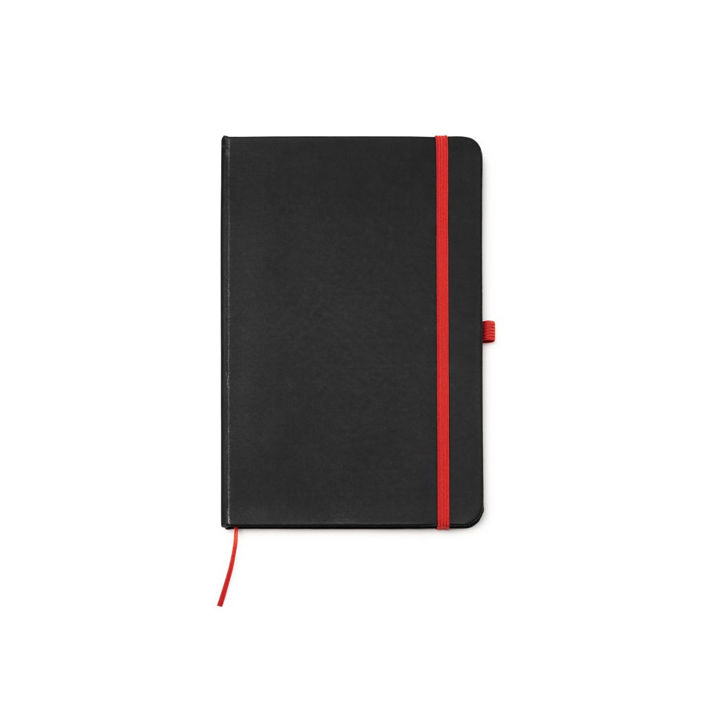 Блокнот формата А5 в твердой обложке из черного полиуретана. Цветная закладка, резинка и держатель для ручки. 80 листов в линейку.