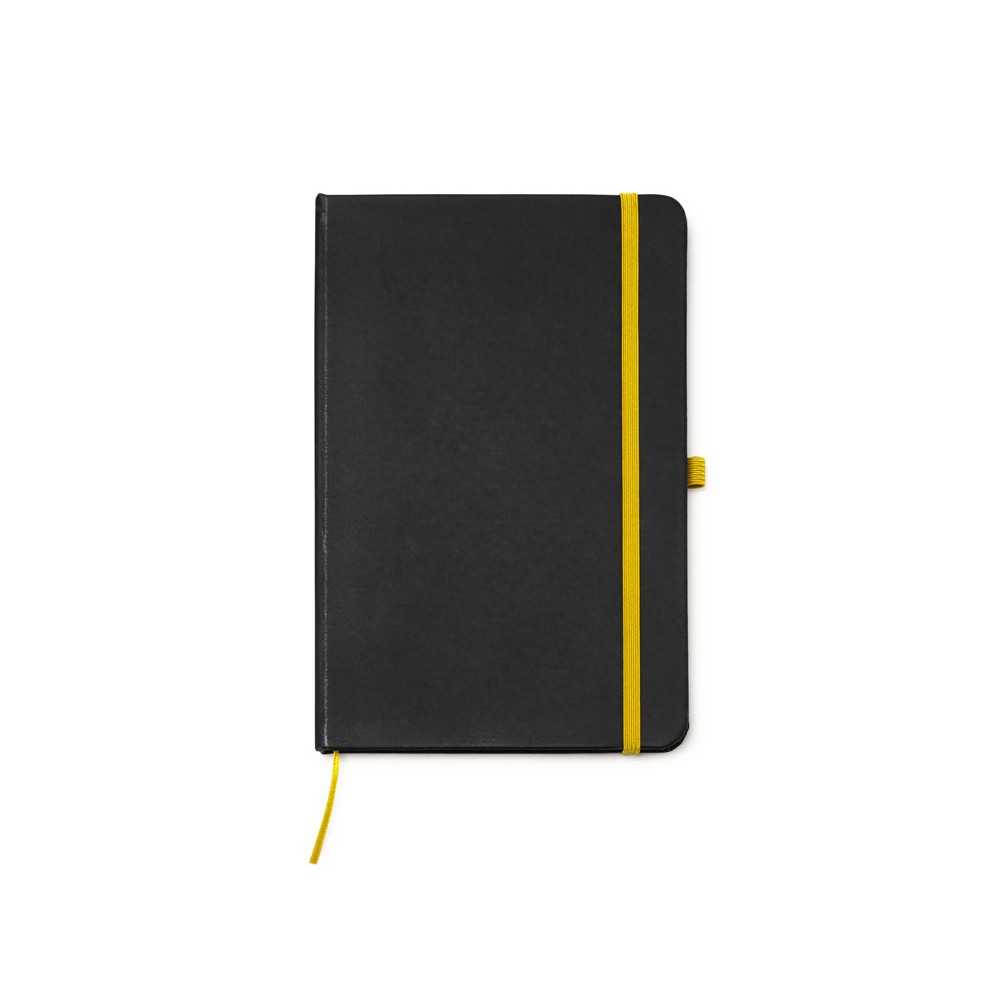 Блокнот формата А5 в твердой обложке из черного полиуретана. Цветная закладка, резинка и держатель для ручки. 80 листов в линейку.