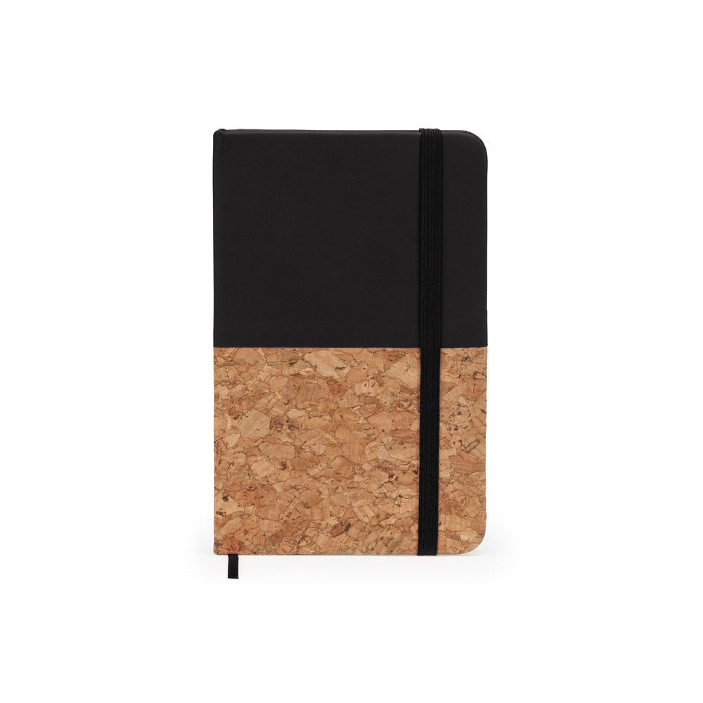 Блокнот формата А6. Комбинированная обложка из пробки/кожзаменителя. Закладка и резинка. 80 листов.