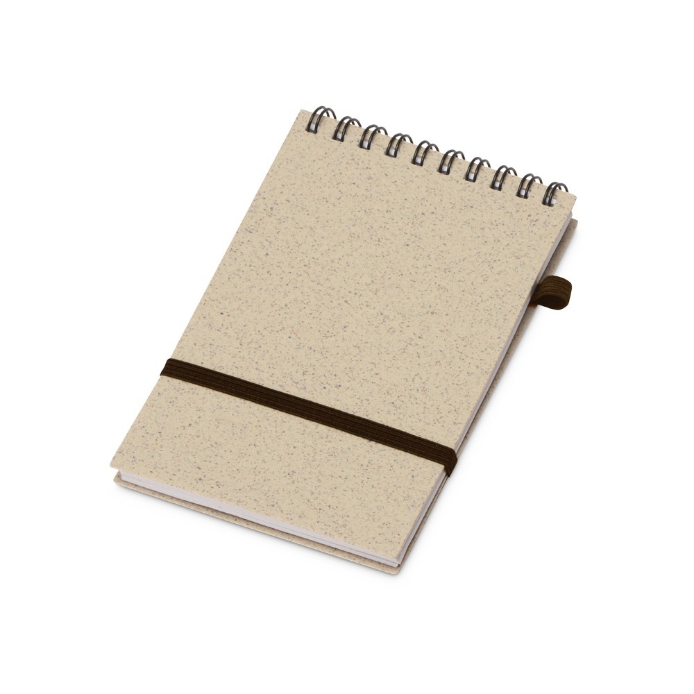 Блокнот с обложкой из переработанной пшеницы и пластика. Блок состоит из 60 листов переработанной бумаги белого цвета. Крепление - пружина. Дополнен петлей для ручки и горизонтальной резинкой.