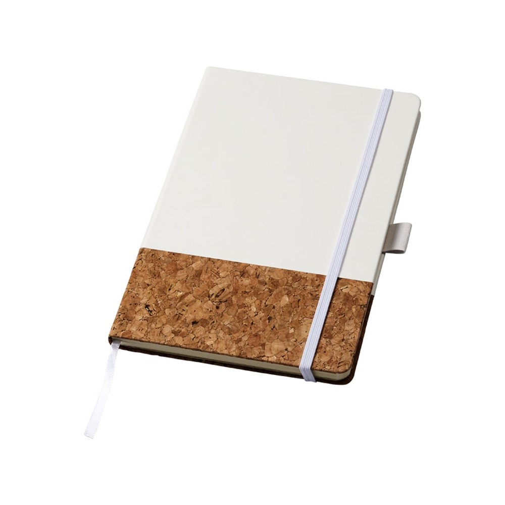 Блокнот Evora формата A5 из пробки и термополиуретана. Стильный блокнот формата A5 с твердой обложкой из искусственной кожи и пробки. Цветная эластичная застежка, лента-закладка, 80 листов линованной бумаги (80 г/м²) кремового цвета и расширяемый карман сзади для небольших заметок. Пробка и ПУ.