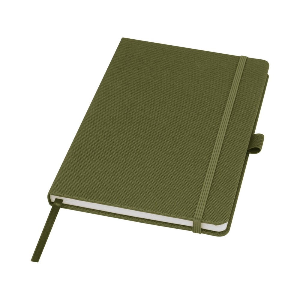 Блокнот формата А5 с обложкой из переработанного ПЭТ. Содержит 80 листов в линию плотностью 70 г/м², изготовленных из переработанной бумаги, с петлей для ручки и лентой-закладкой. Может быть дополнен шариковой ручкой Honua 107757 из переработанного ПЭТ. Переработанный PET пластик. FSC Recycled 100% P7 CU-COC-877277.