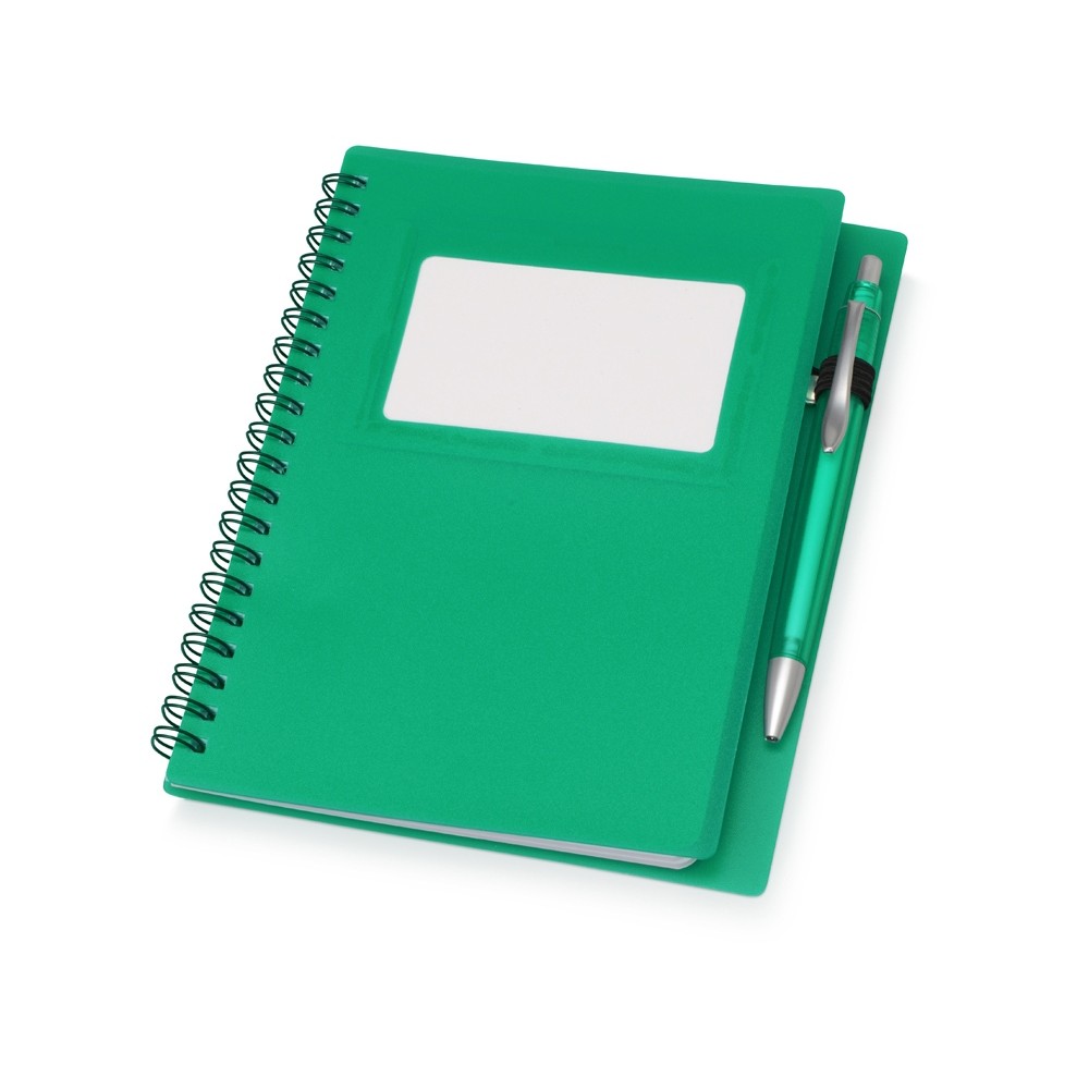 Блокнот Контакт в полипропиленовой обложке переплетен на пружине. В обложке блокнота предусмотрено окошко, в которое можно поместить визитную карточку или полиграфическую вставку. В комплекте с блокнотом идет ручка, которая вставляется в петельку сбоку.