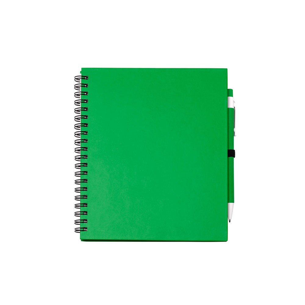 Блокнот на спирали с простыми листами и держателем для ручек. Твердая обложка и ручка из переработанного картона. 70 листов.