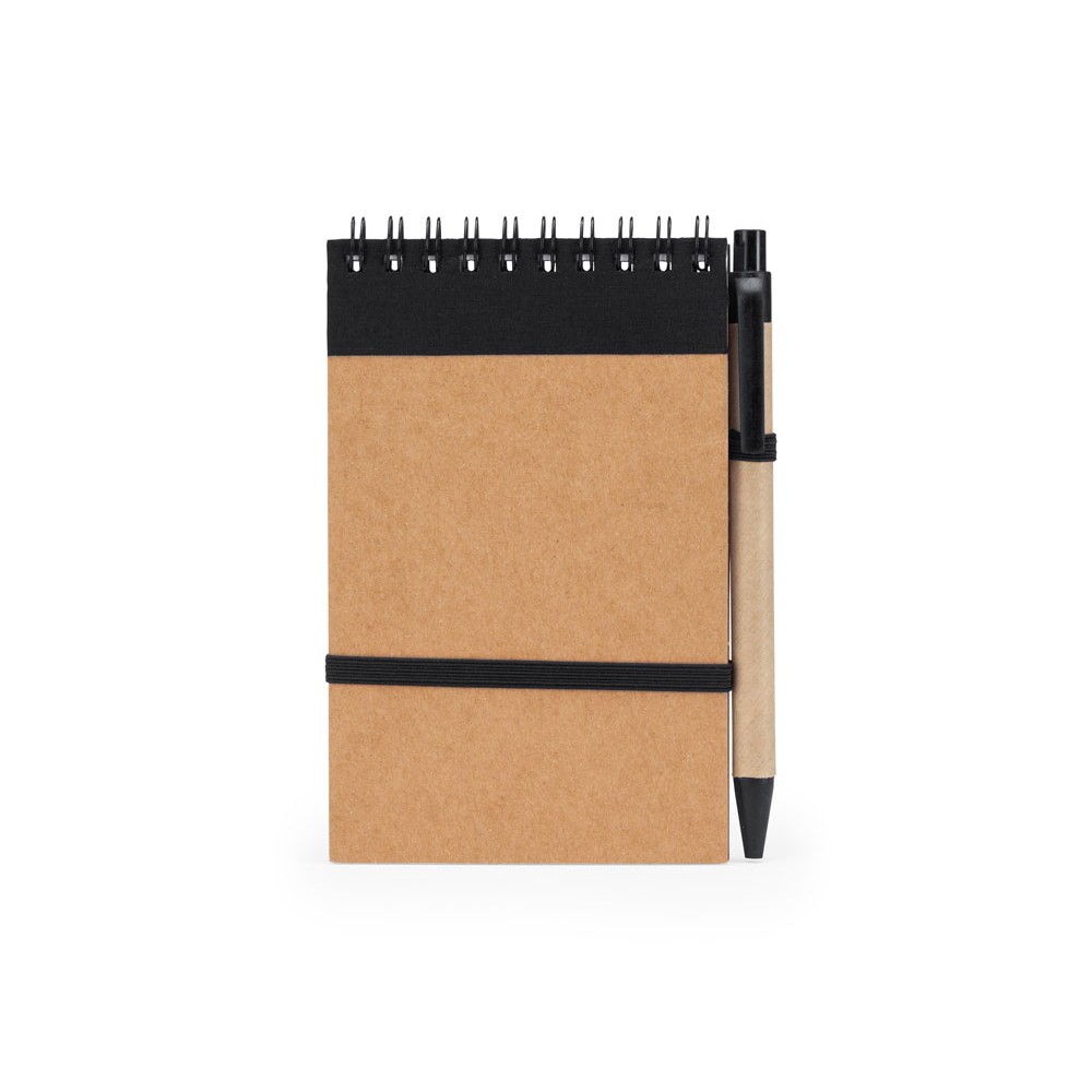 Блокнот на спирали с жесткой обложкой из переработанного картона. Включает шариковую ручку с синими чернилами. 70 листов.