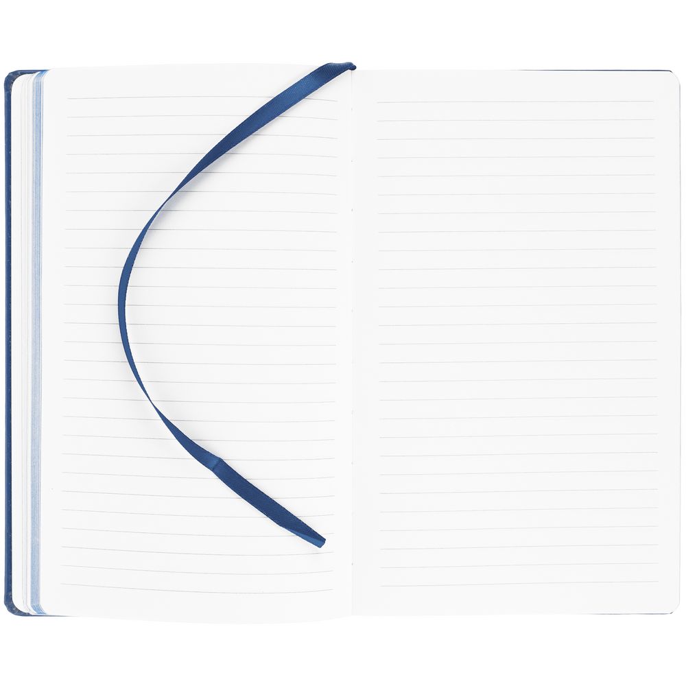 Блокнот в твердой обложке, выполнен из материала Soft Touch Pearl, синий НН, дополнен резинкой и ляссе в цвет обложки.